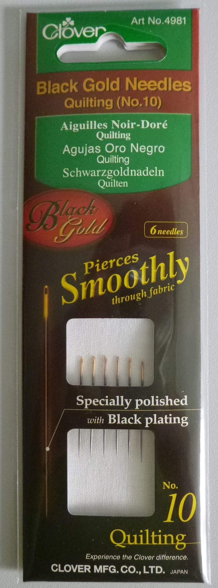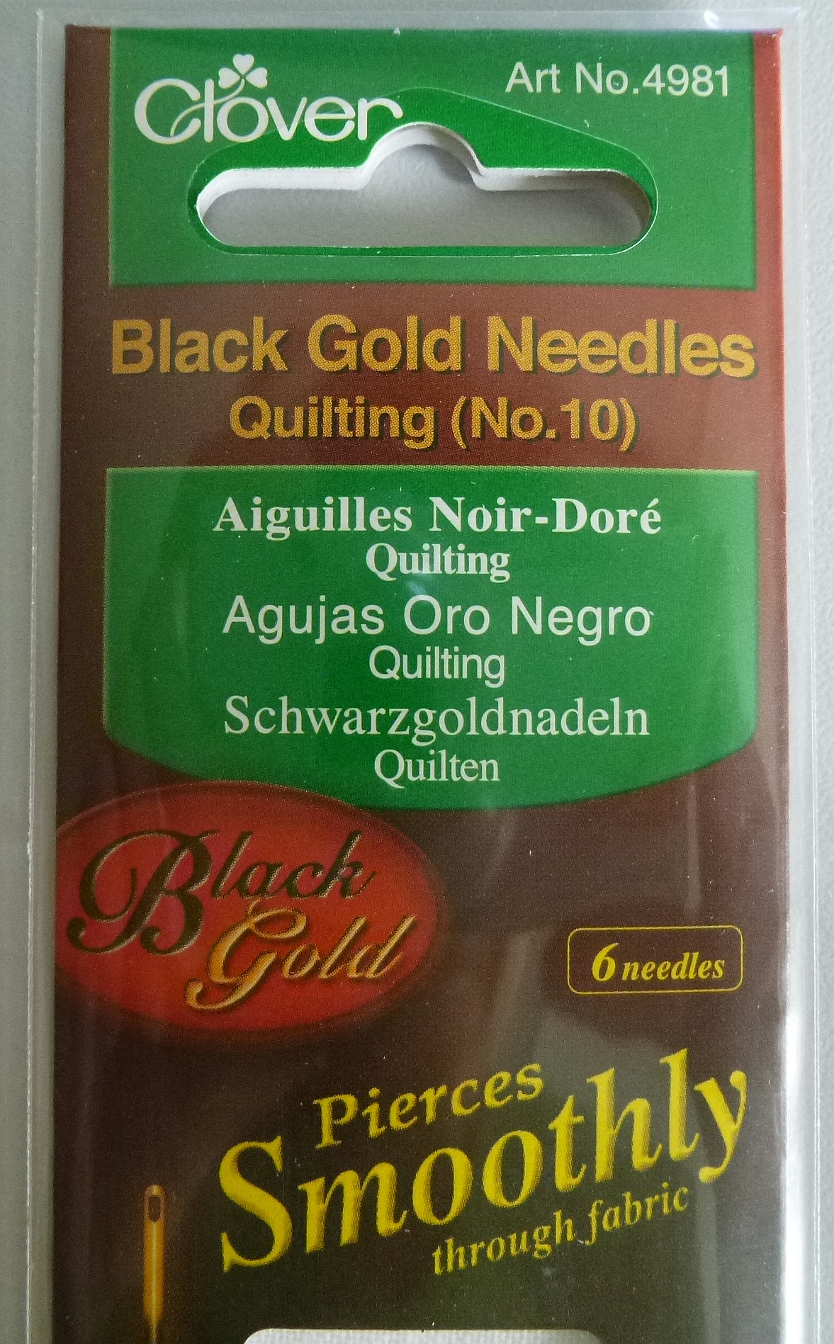 Clover Schwarzgoldnadeln sind bei vielen Quilterinnen sehr beliebt. Sie sind schwarz-plattiert zur Verbesserung der Korrosionsbeständigkeit. Inhalt 6 Nadeln No.10. Größe 0,56 x 25,8 mm.