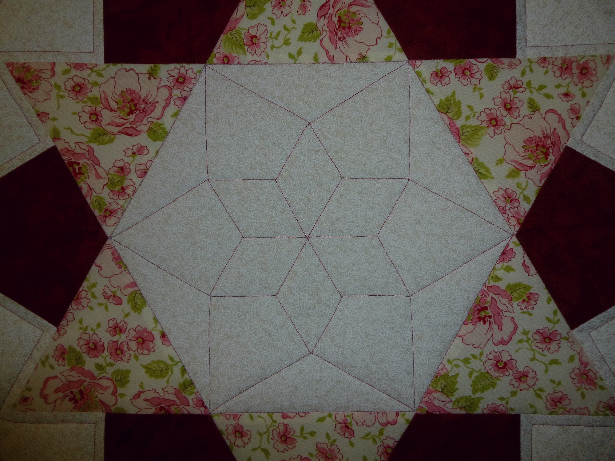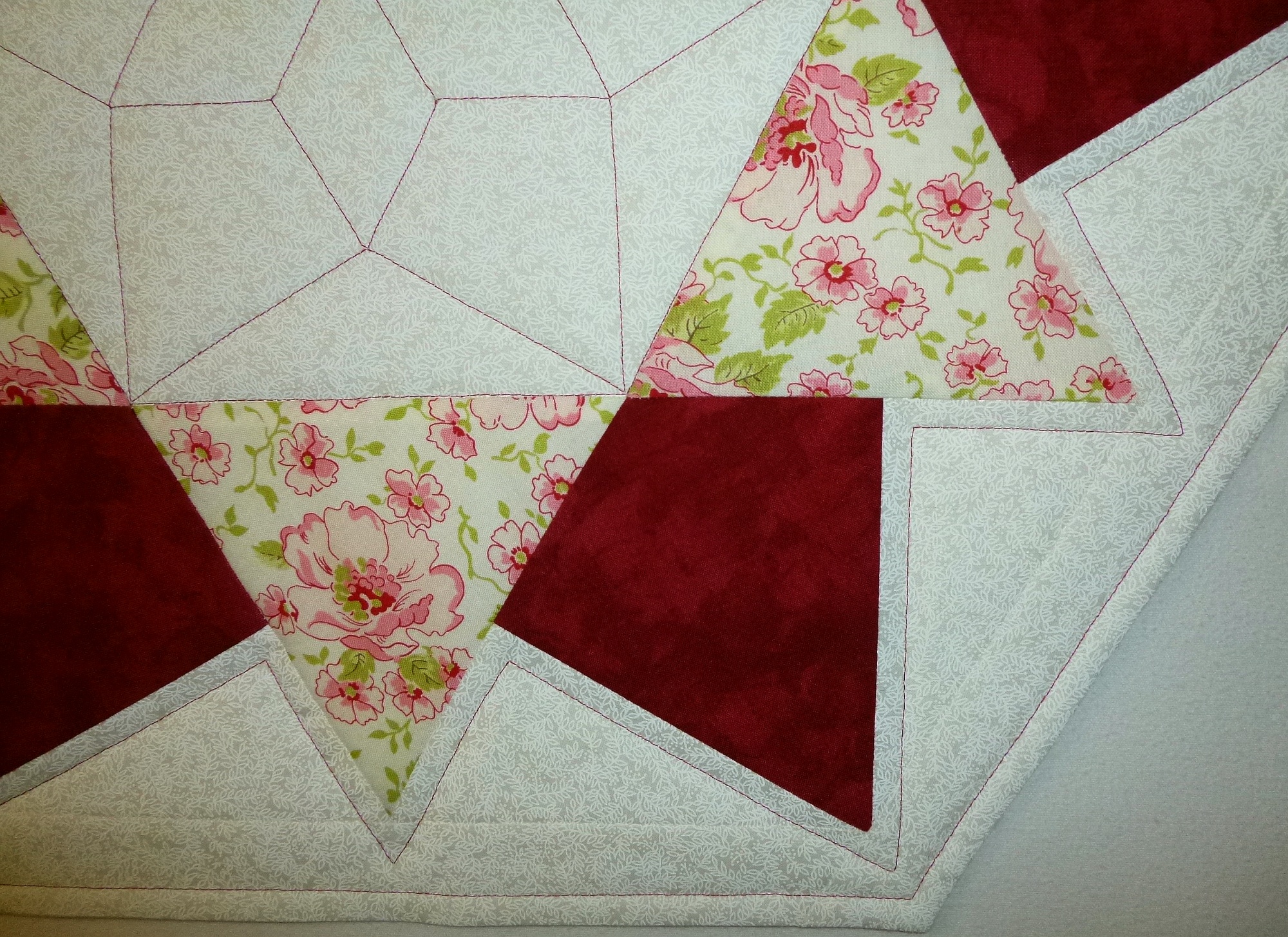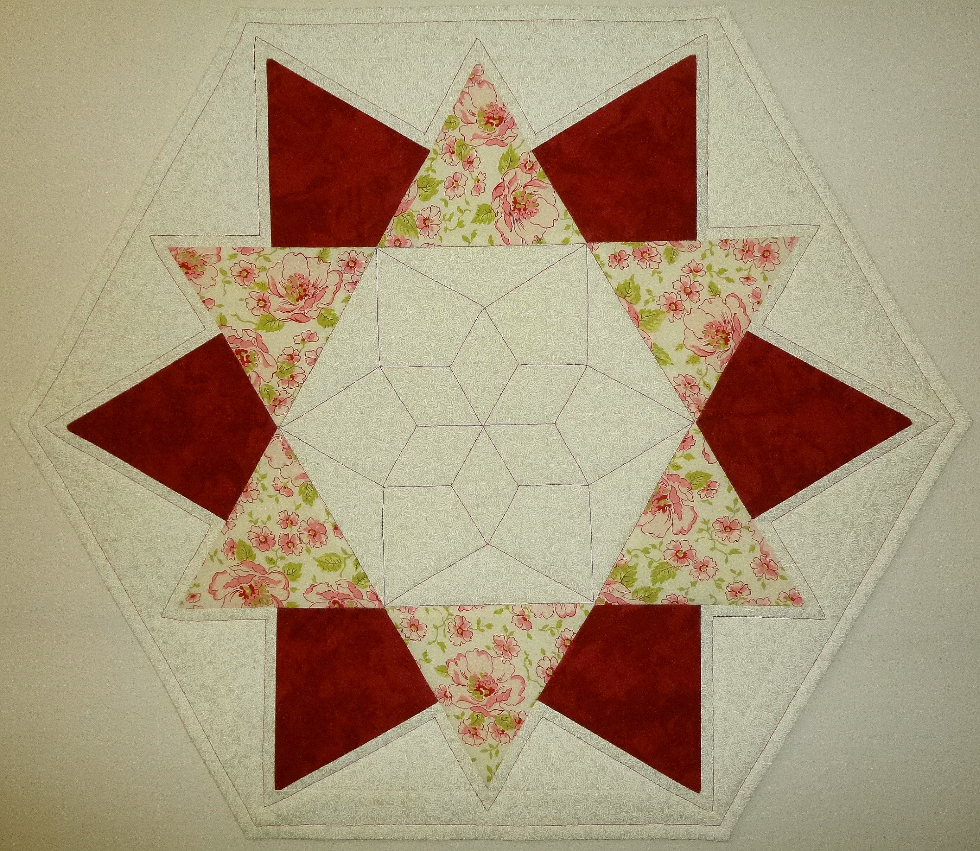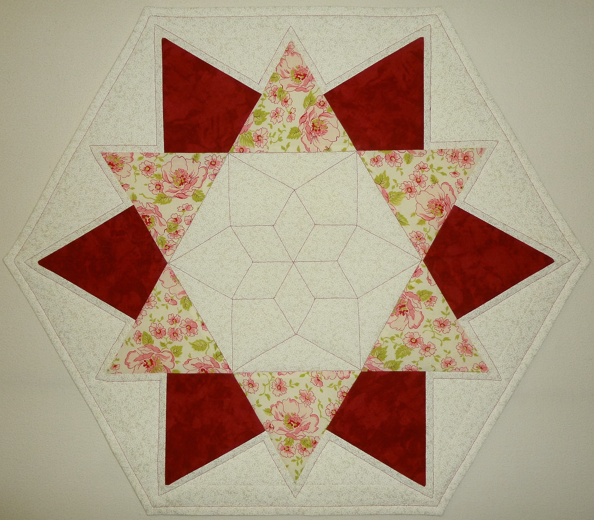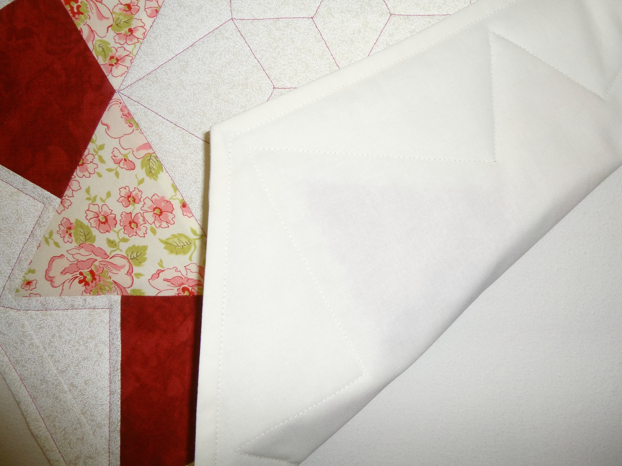 Aus hochwertigen Baumwollstoffen in Patchwork selbst genäht, mit Polyestervlies gefüttert, mit rotem Garn maschinengequiltet. Rückseite natur.