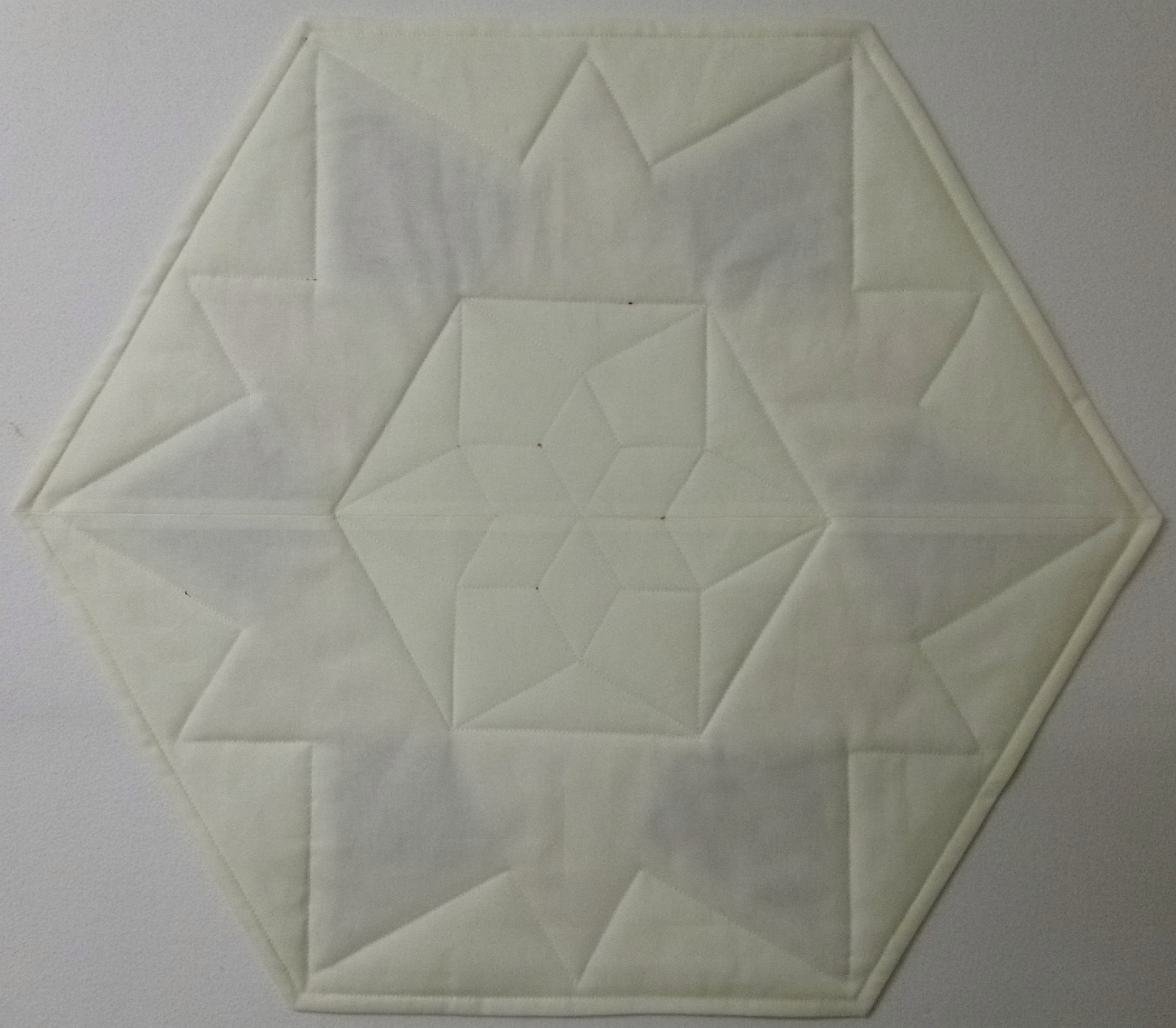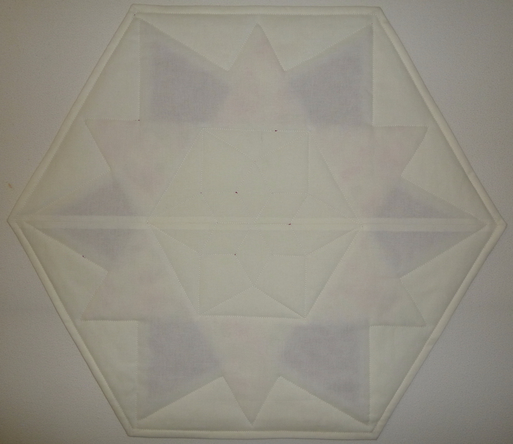 Sechseckiges Deckchen aus Patchwork, Durchmesser von Spitze zu Spitze 64 cm, Breite 55 cm, 100 % Baumwolle.