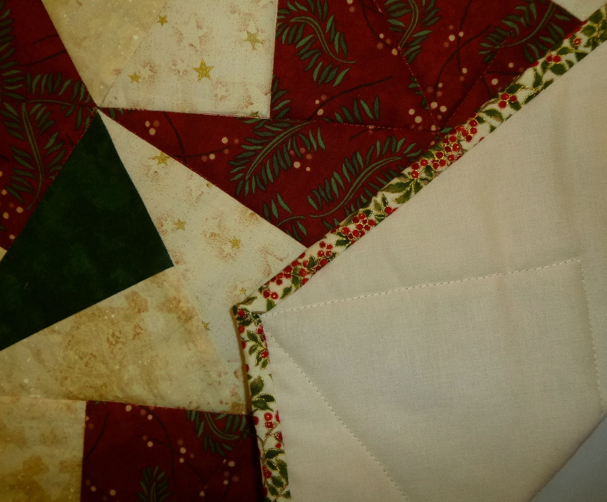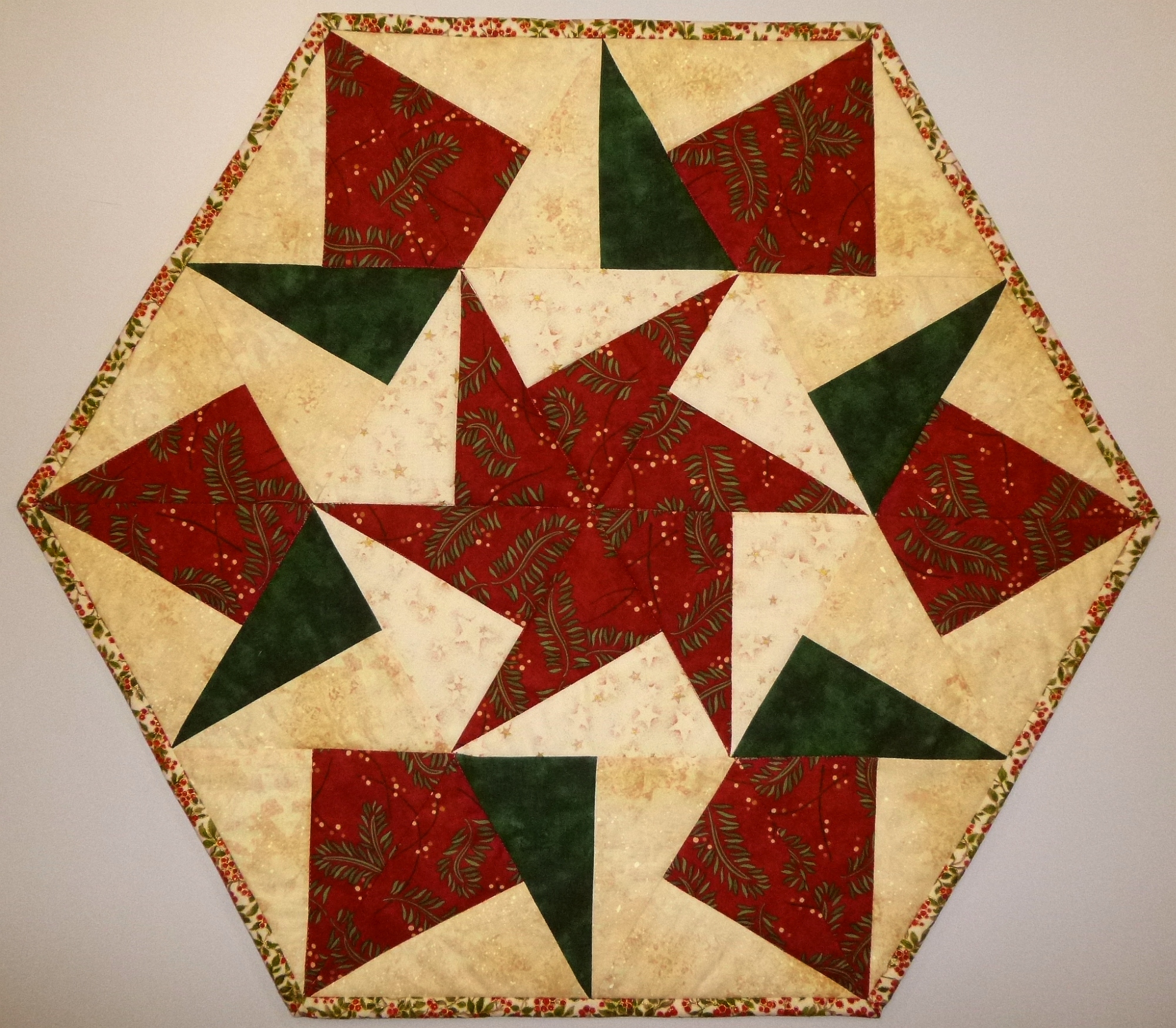 Sechseckiges Deckchen aus Patchwork, teils weihnachtliche Stoffe, Durchmesser von Spitze zu Spitze 57,5 cm, Breite 50 cm, 100 % Baumwolle.