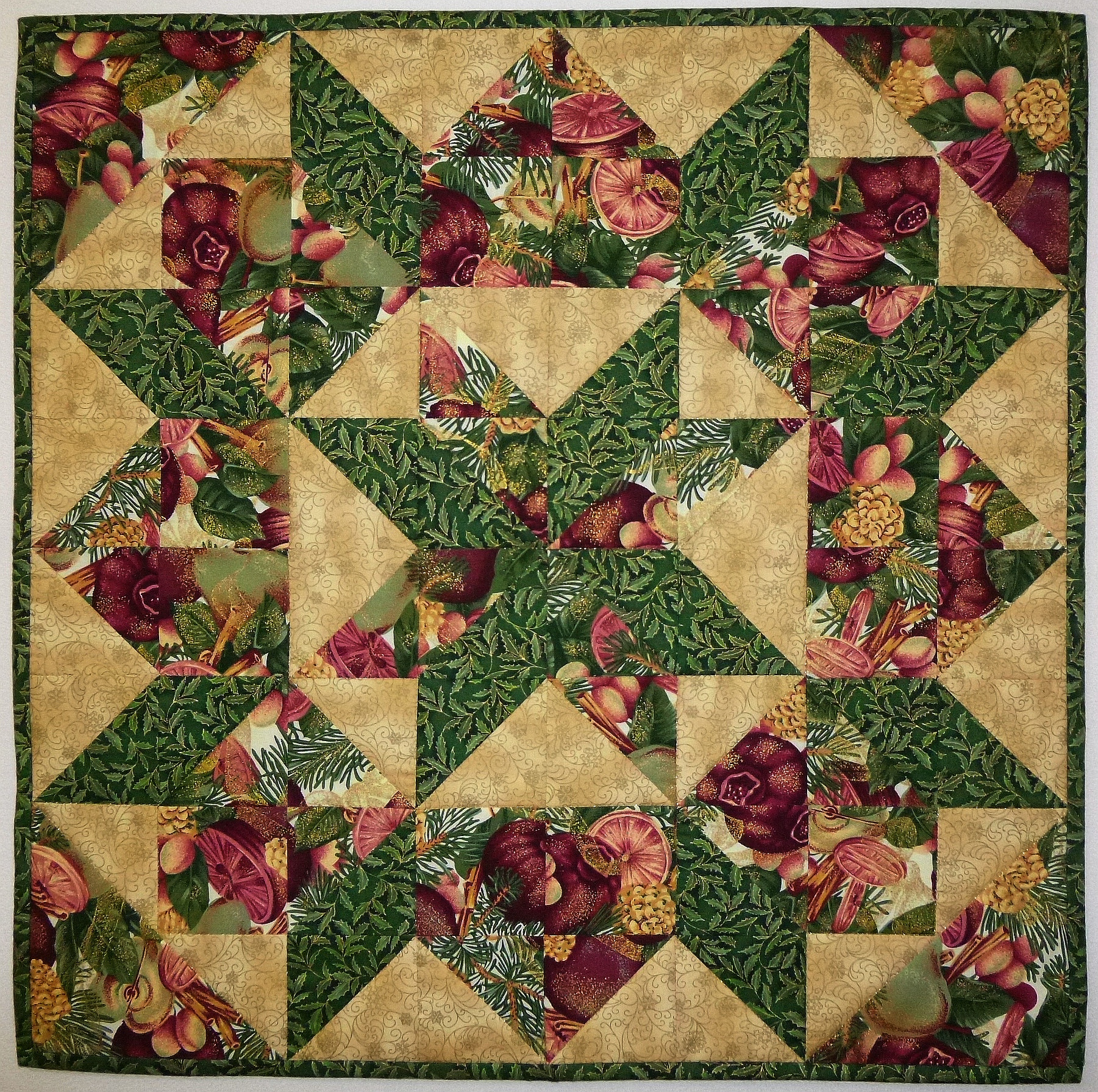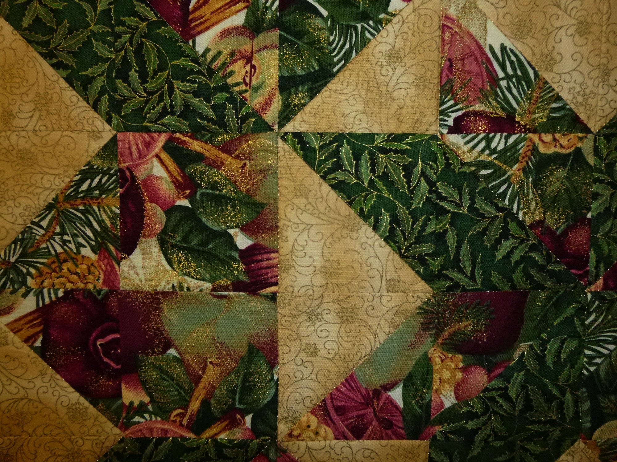 Aus hochwertigen Baumwollstoffen in Patchworktechnik selbst genäht, mit Polyestervlies gefüttert, mit Goldgarn maschinengequiltet. Rückseite beige.