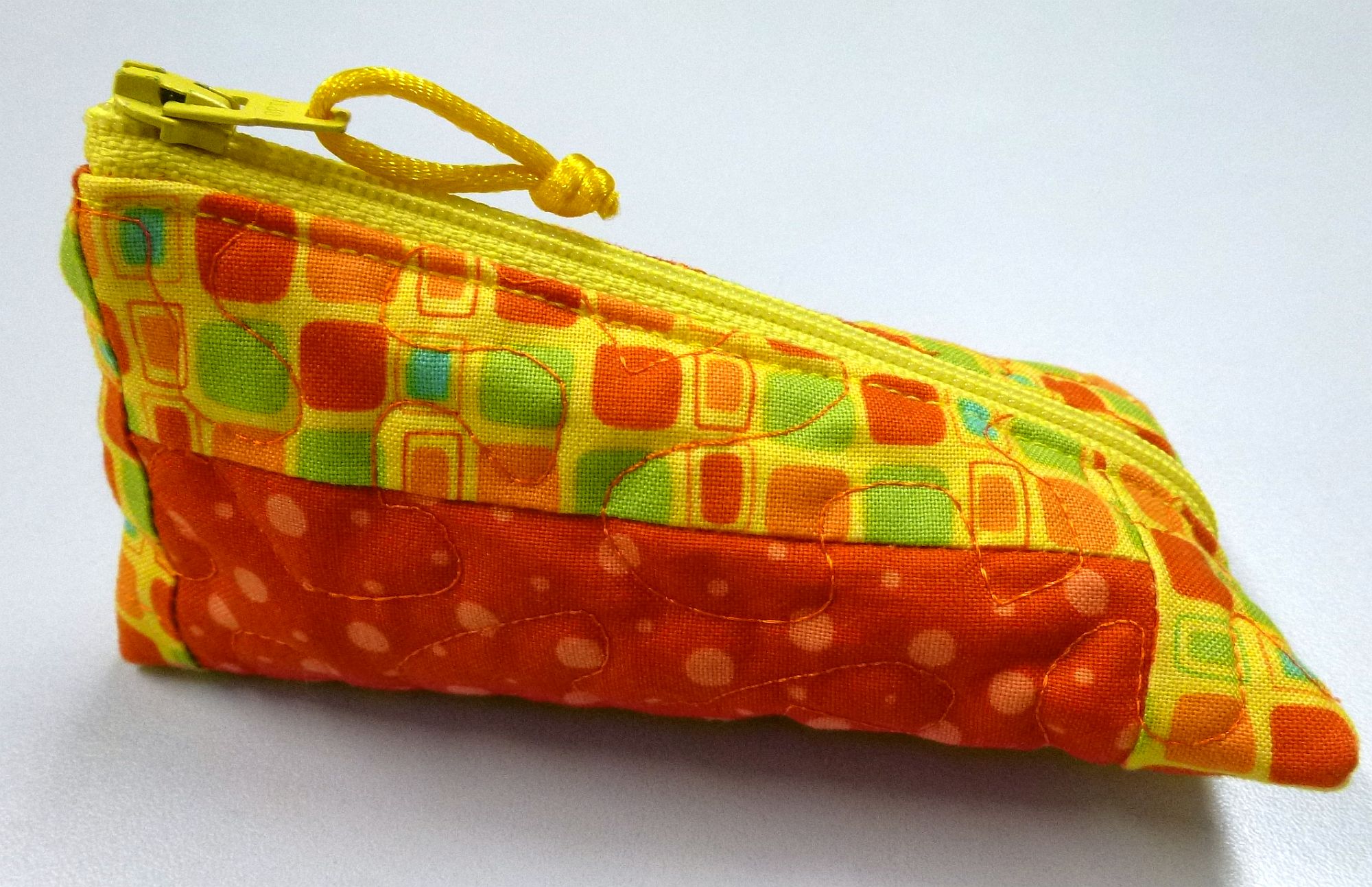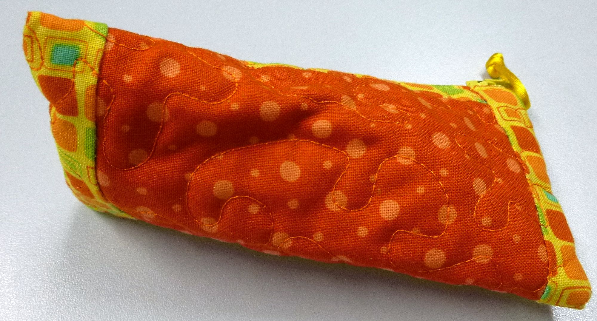 Schlüsselmäppchen in Tetraederform mit Reißverschluß in gelb und Schlüsselring, 13 cm breit, 7 cm hoch, 100 % Baumwolle.