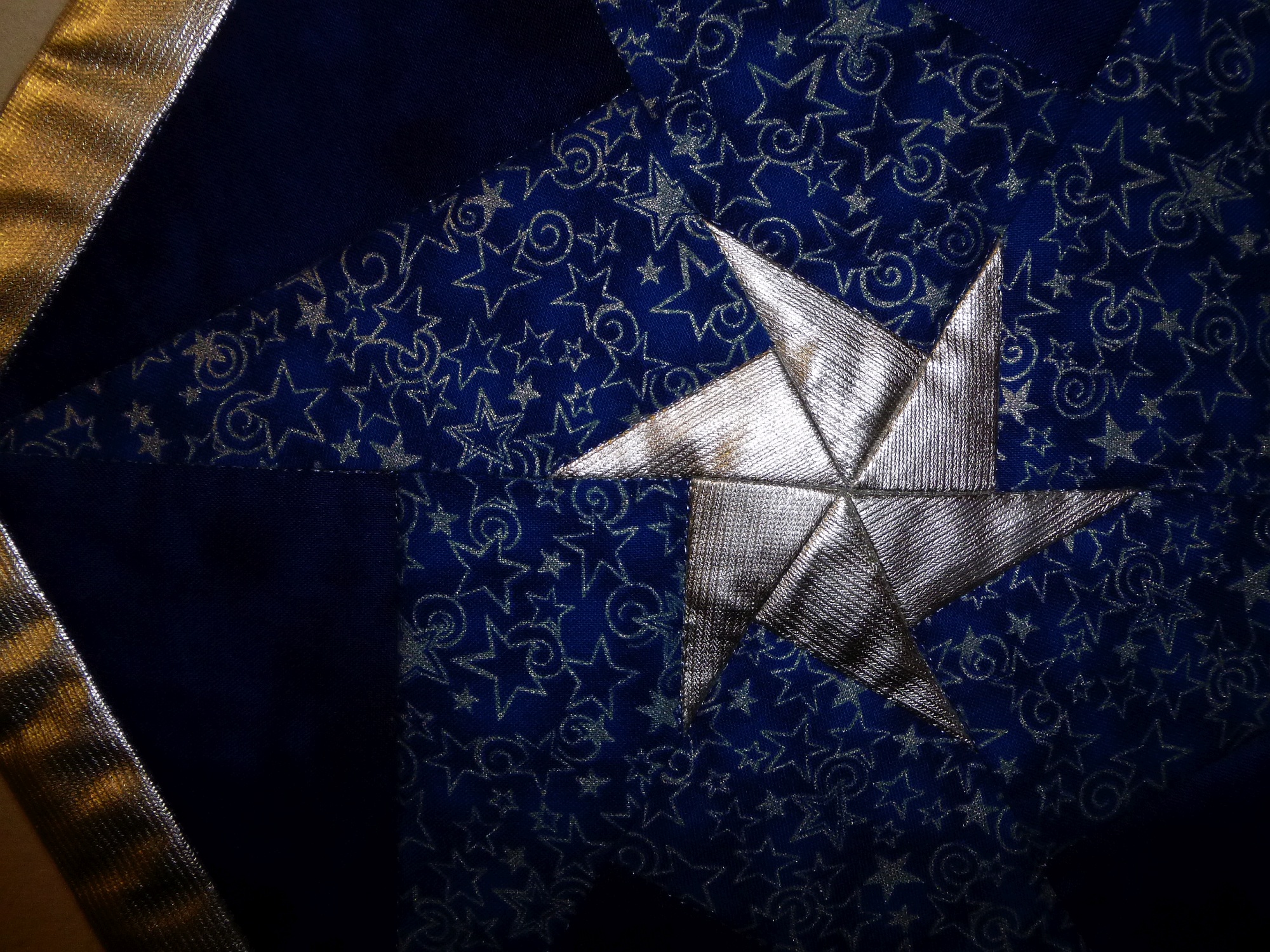 Sternendeckchen aus Patchwork, weihnachtliche Stoffe, Durchmesser von Spitze zu Spitze 35 cm, von Seite zu Seite 30,5 cm, 100 % Baumwolle. Der Silberstoff ist beschichtet, bei 40°C waschbar, jedoch beim Bügeln Tuch unterlegen!