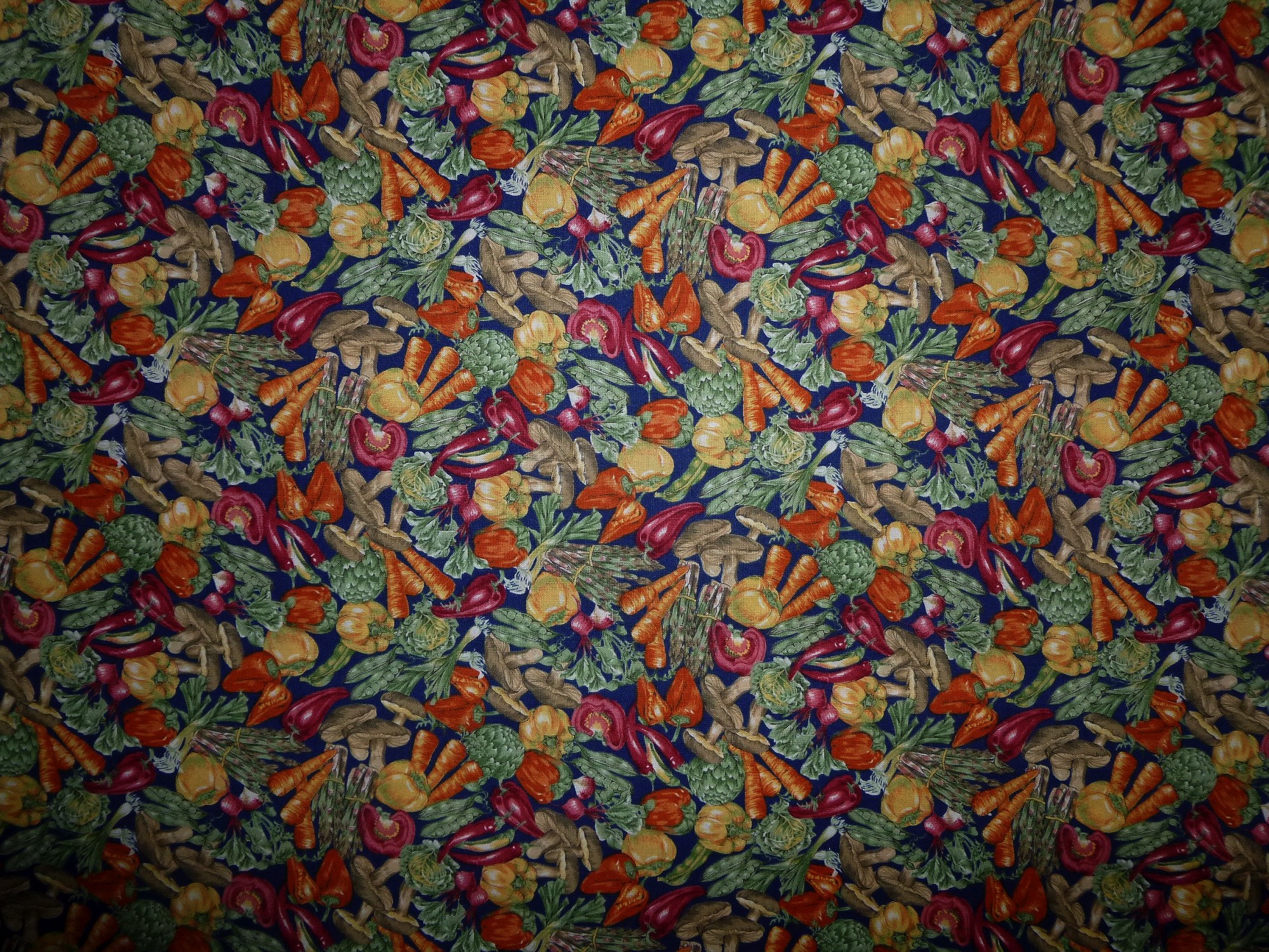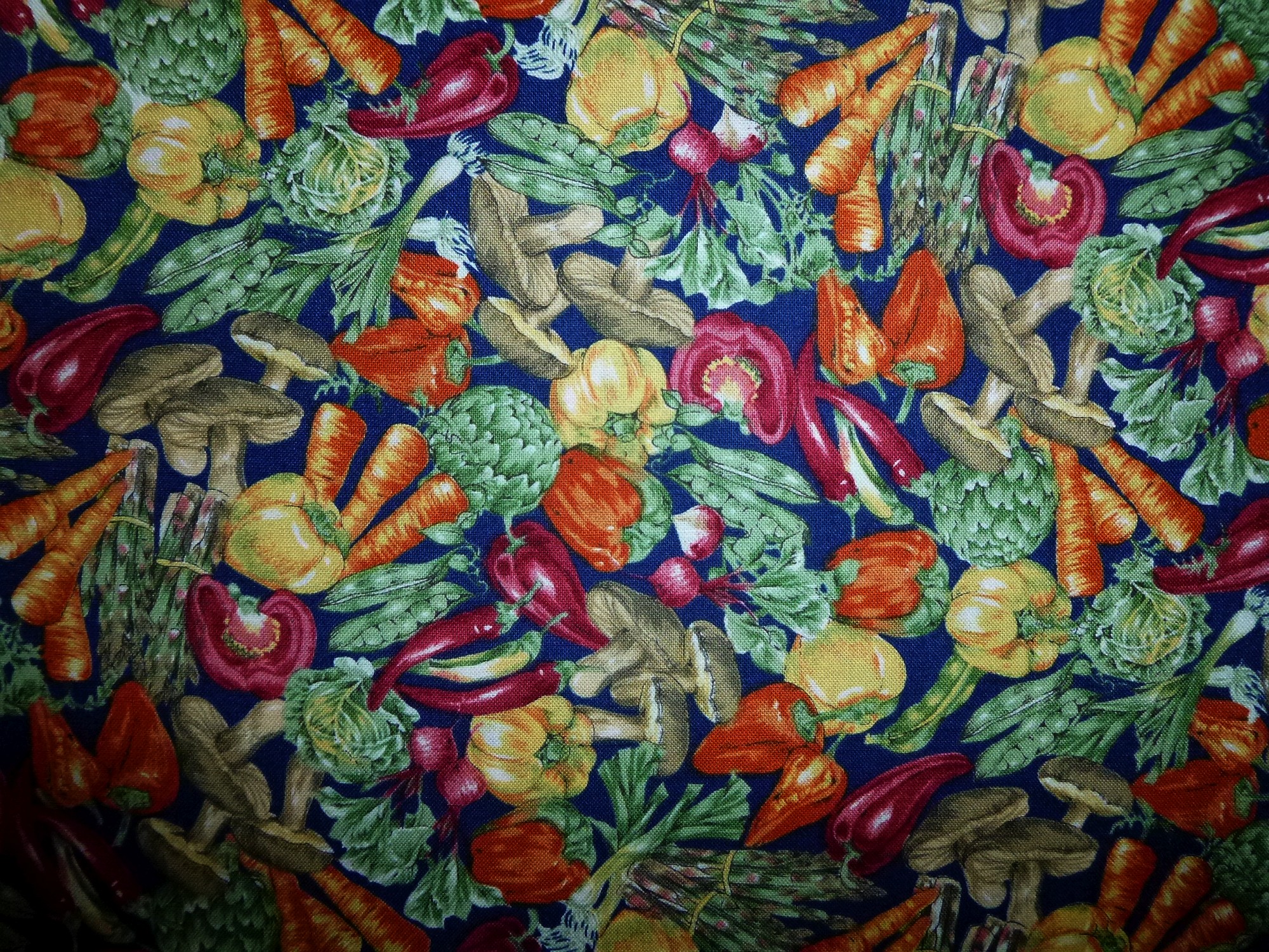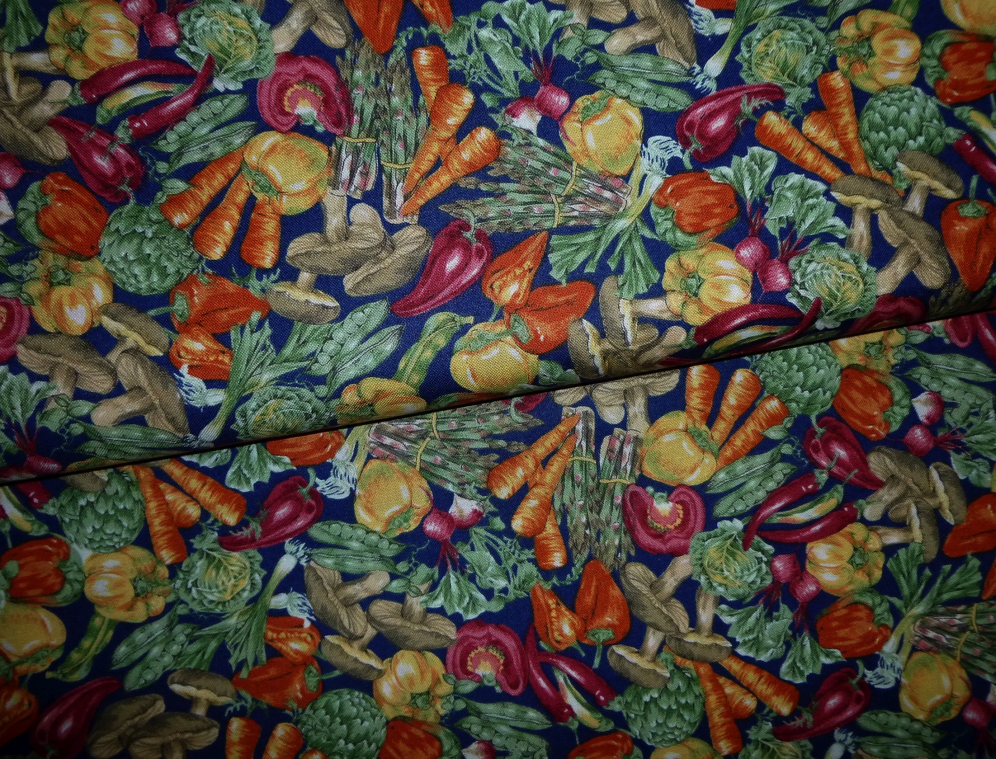 Auf dunkelblauem Untergrund sind verschiedene Gemüse in rot, orange, grün und gelb aufgedruckt. Karotten, Paprika, Erbsen, Spargel, Pilze, Artischocken und mehr im Allover-Print machen diesen Stoff unverzichtbar für alles rund um Küche und Essen.