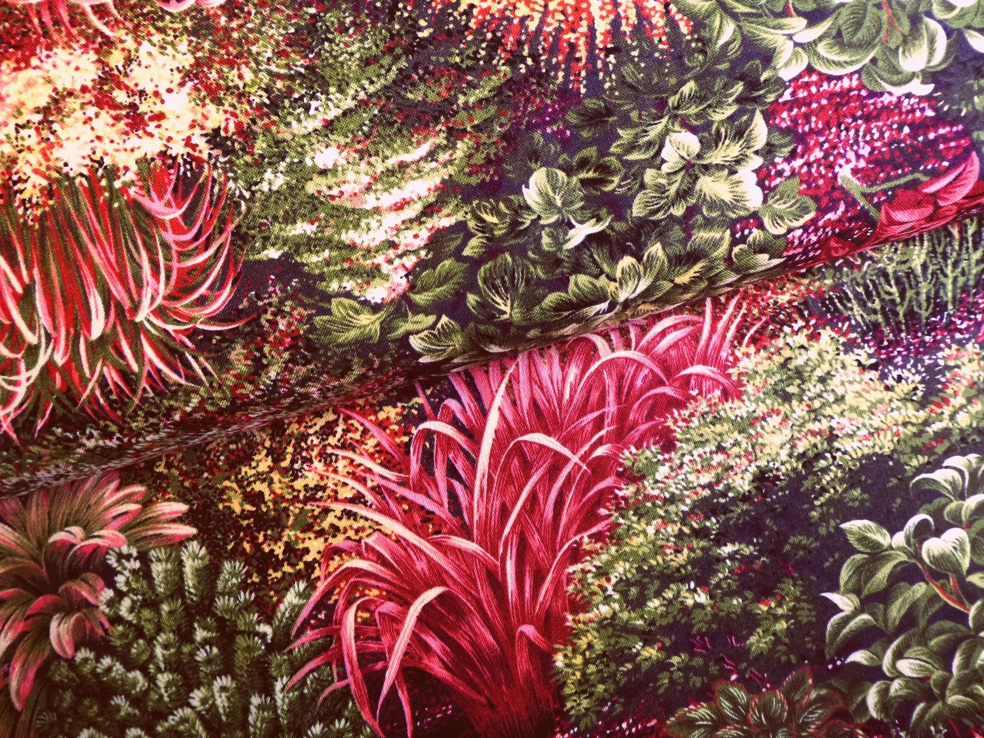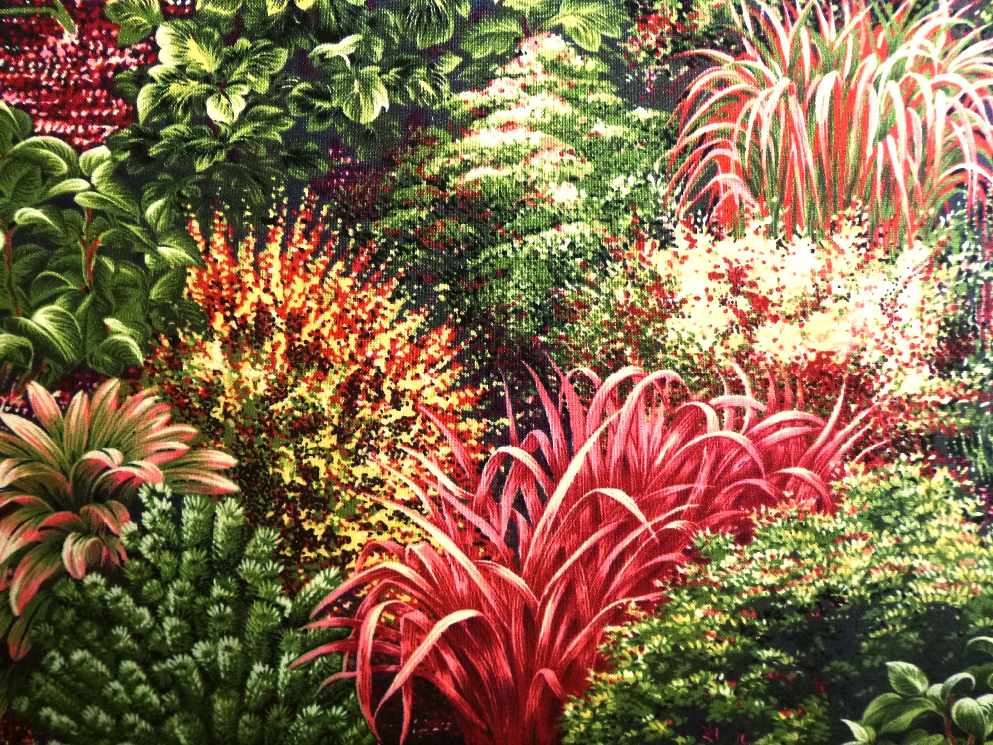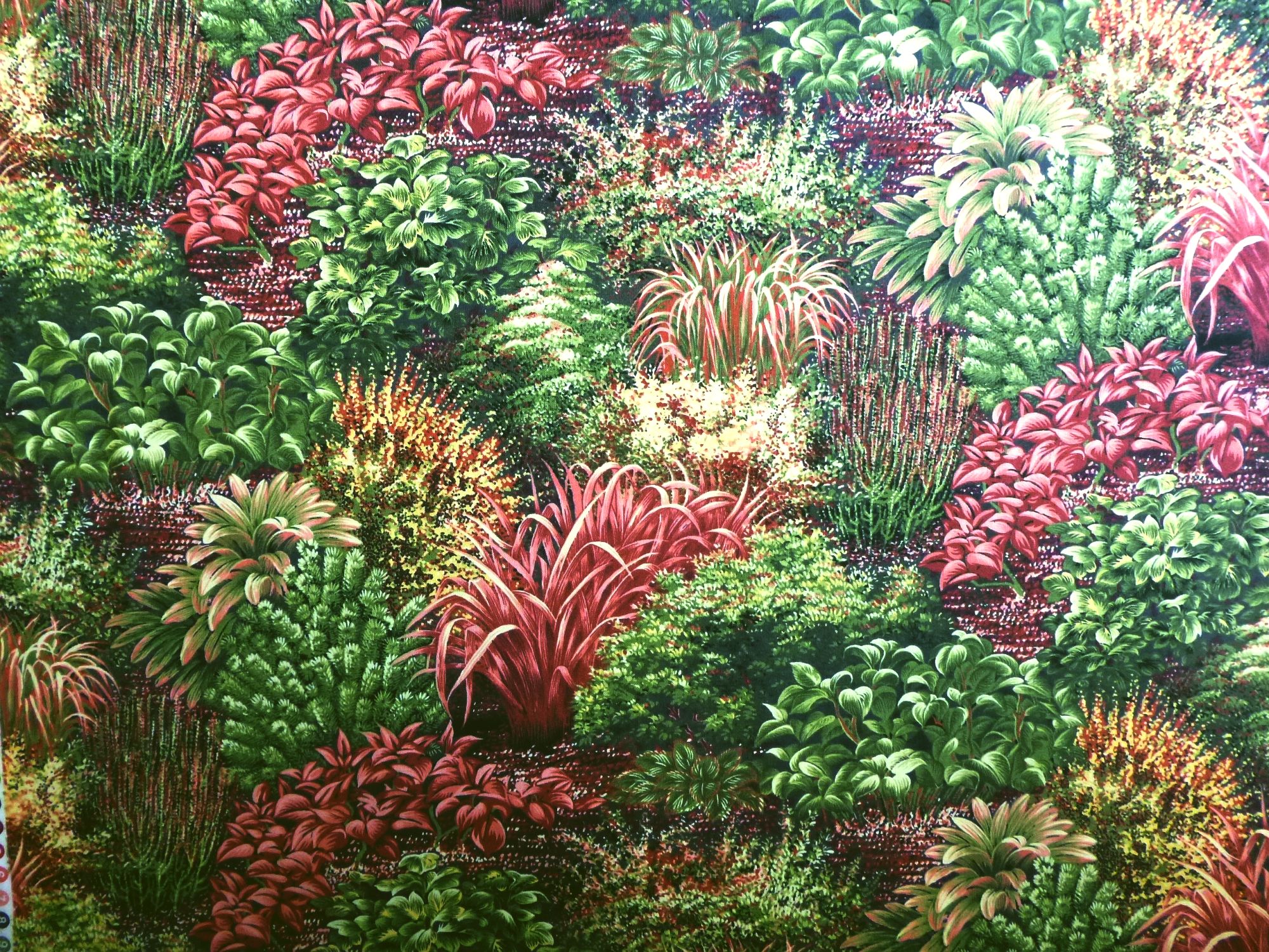 Gräser und Stauden in hellbordeaux und grün sind in Tuffs aufgedruckt. Dadurch können verschiedene zueinander passende Muster ausgeschnitten und z. B. für Applikationen oder Landschaftsbilder eingesetzt werden.