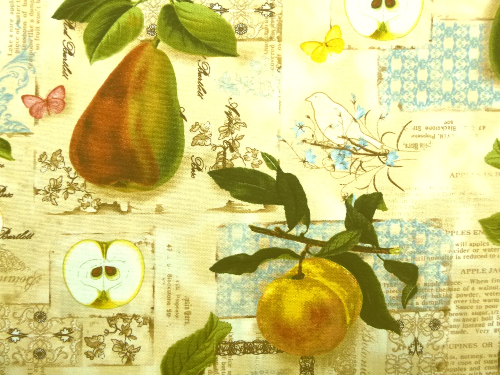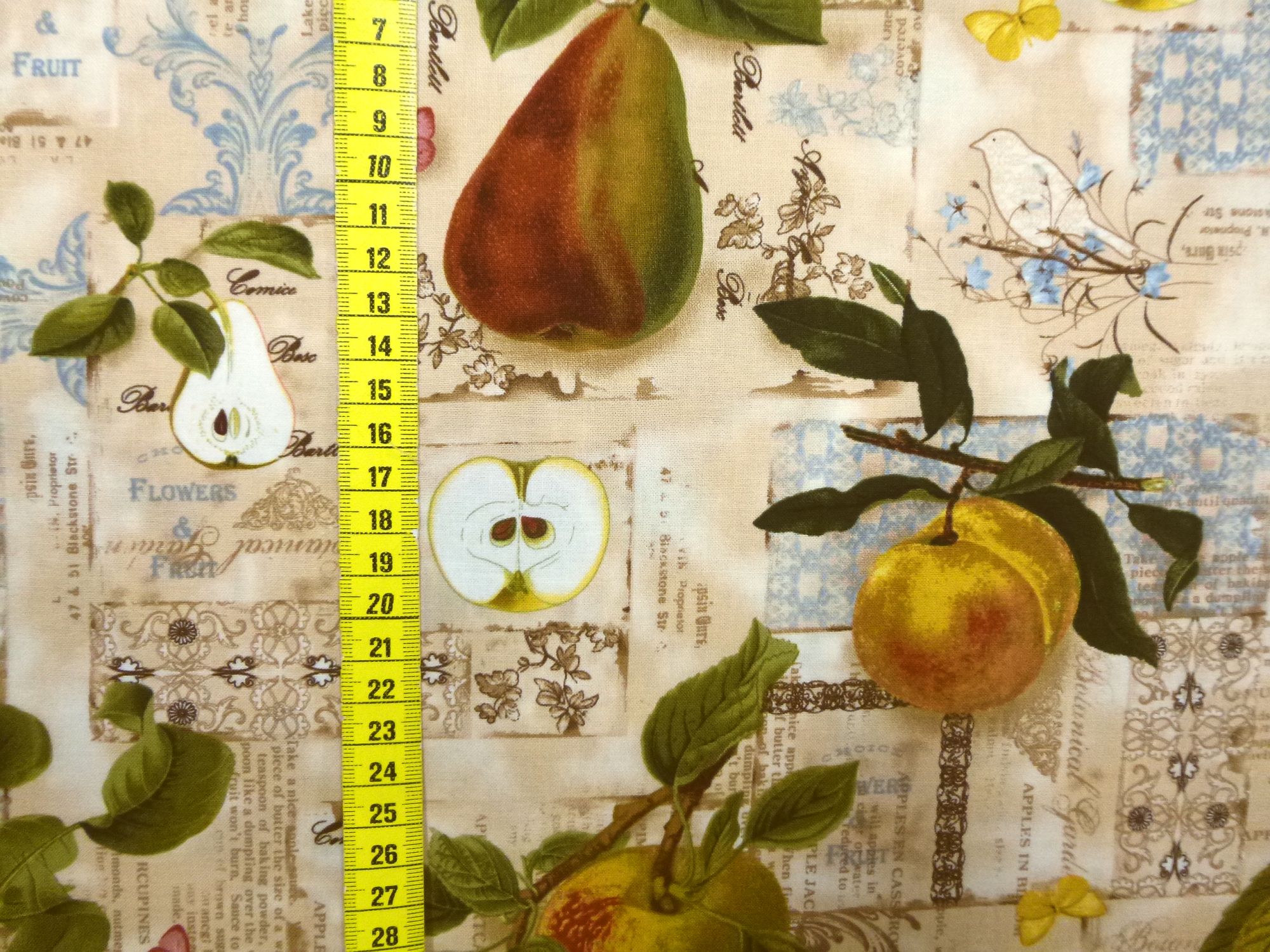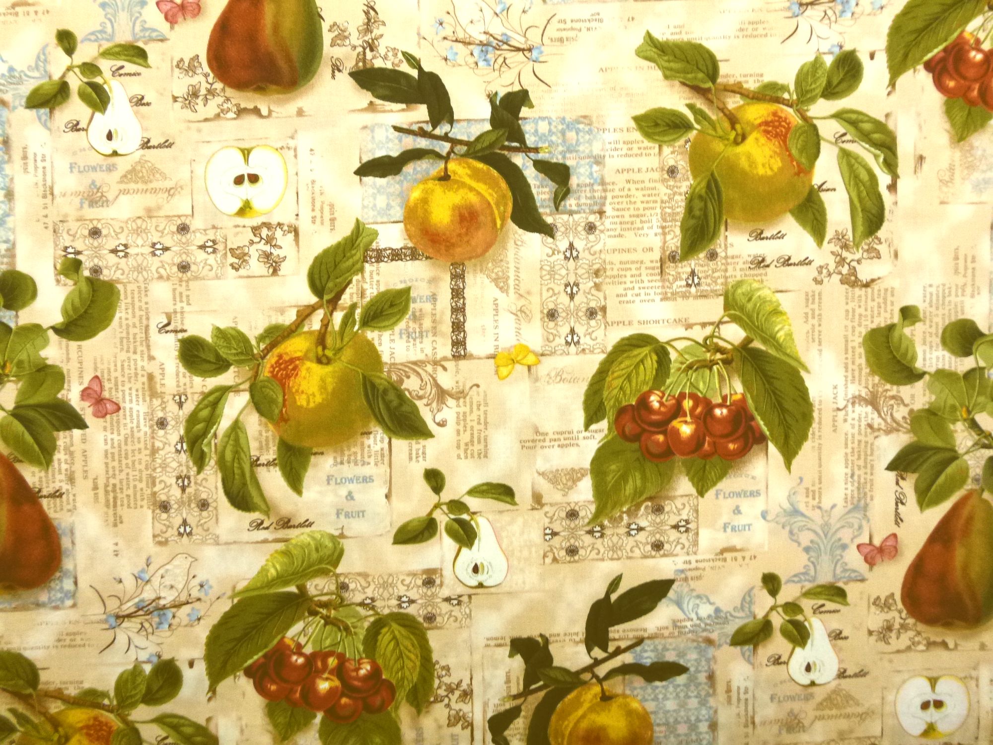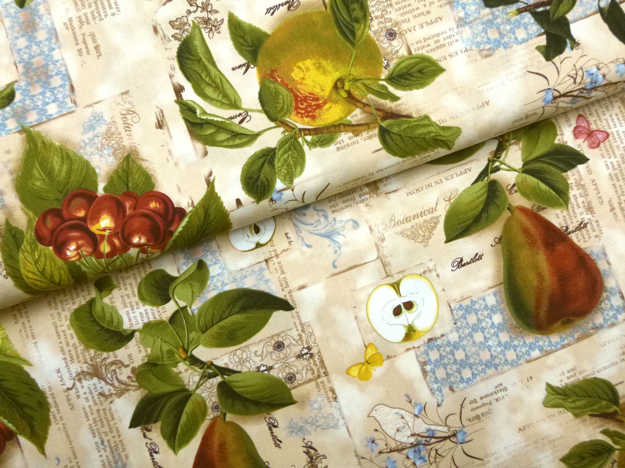 Stoff mit Äpfeln, Birnen, Kirschen