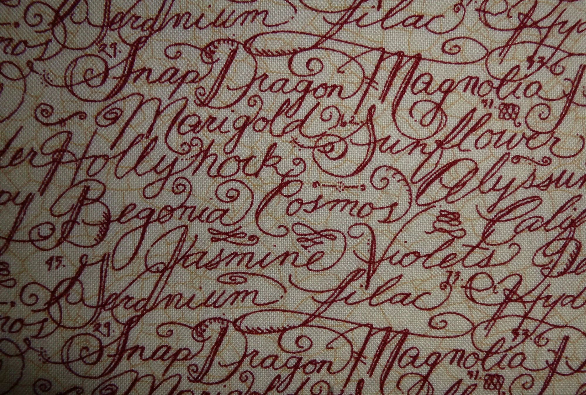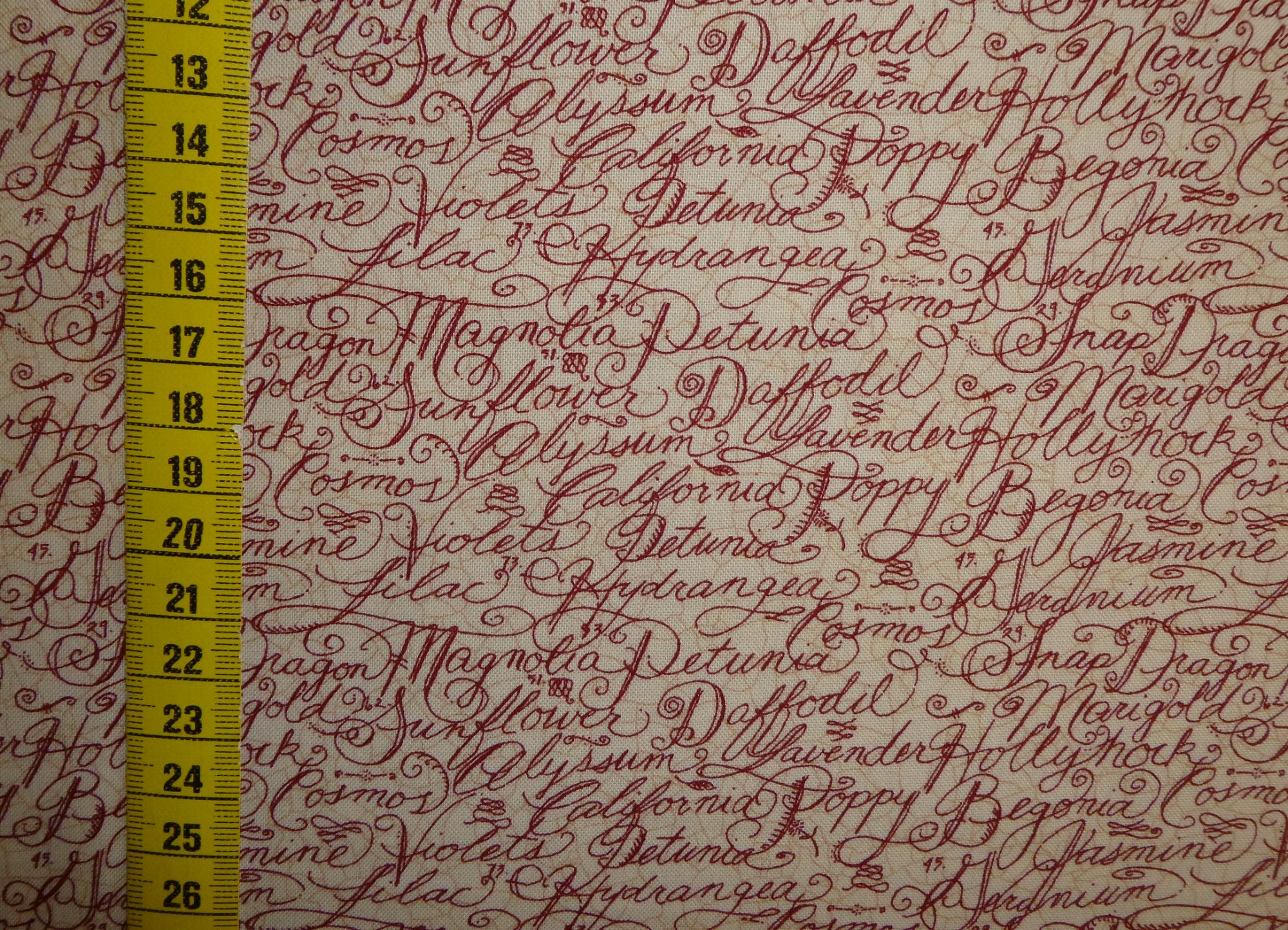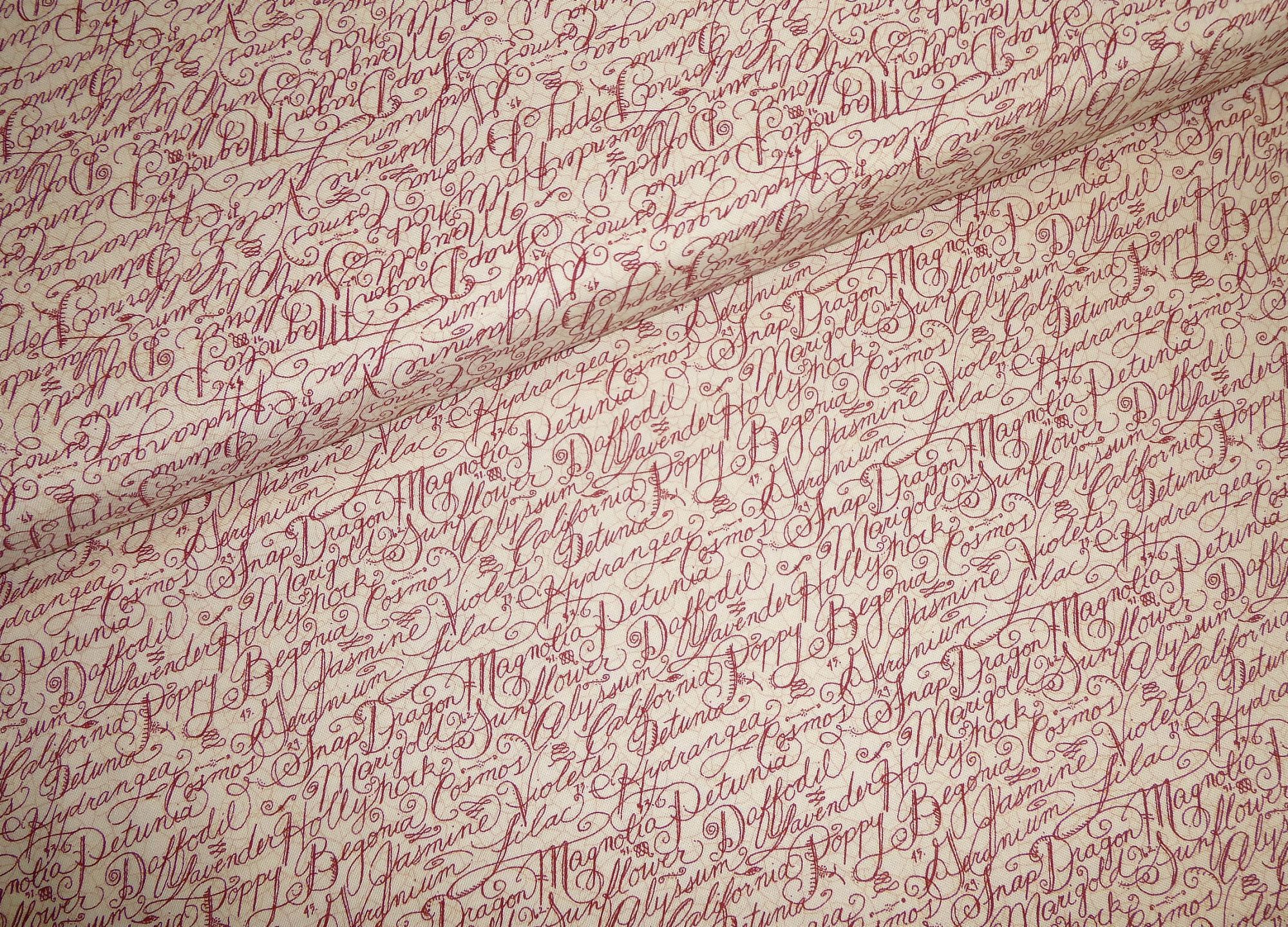 Blumennamen in englischer Sprache sind auf diesen Stoff gedruckt. Er ist gut kombinierbar mit Rosenstoffen.