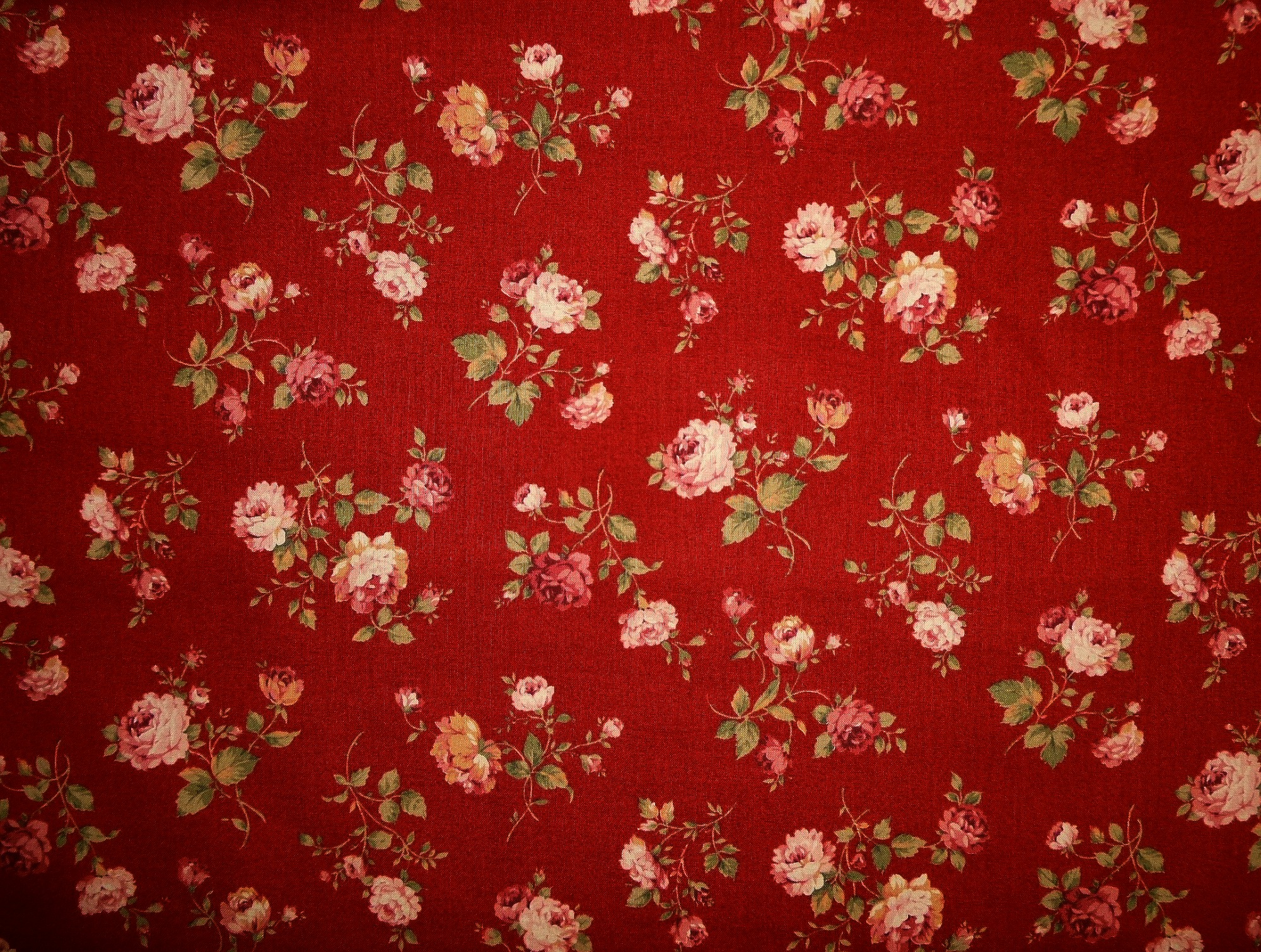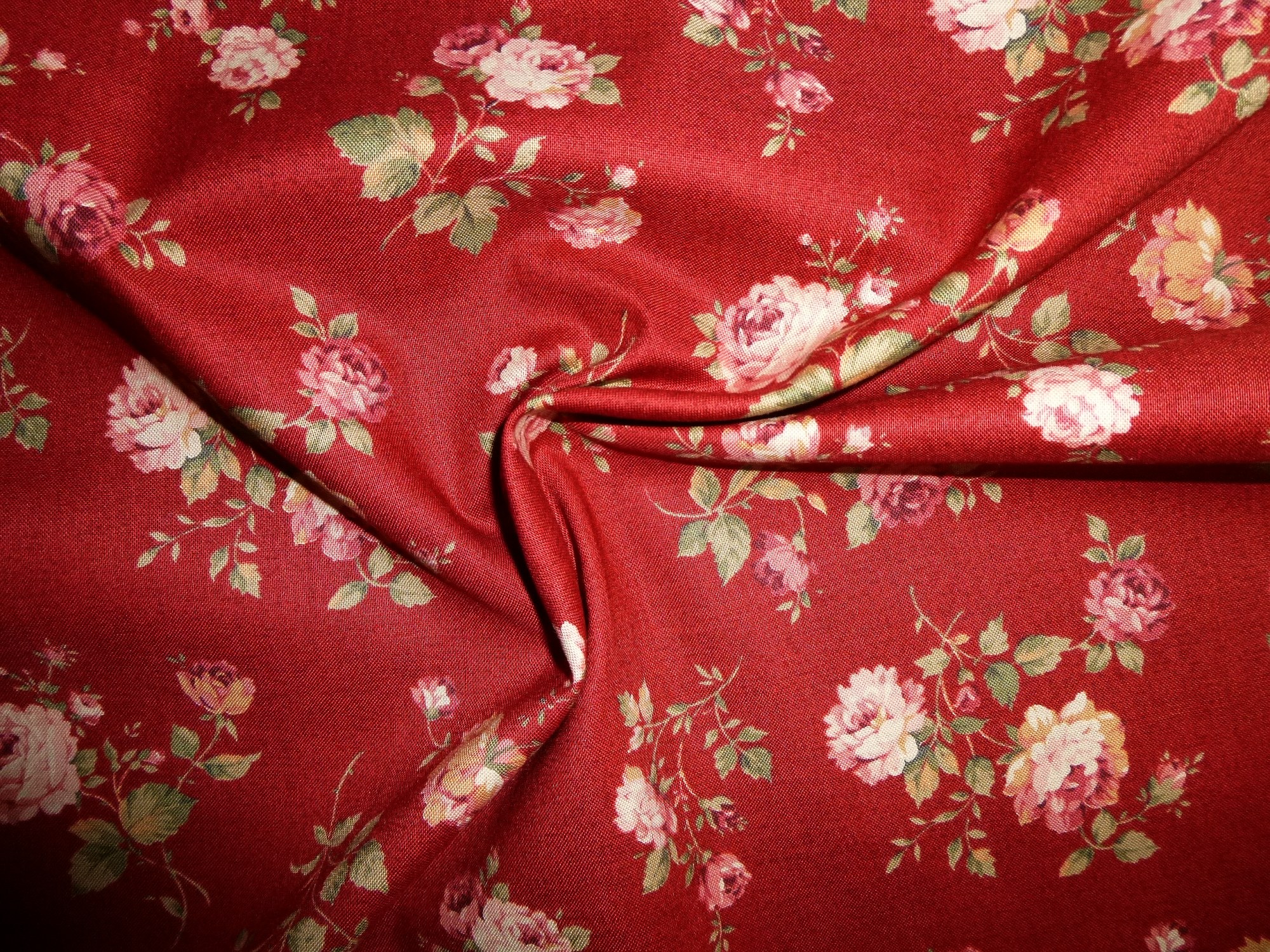 Kleine rosa Rosenbouquets auf dunkelrotem Hintergrund. Ein antiker Rosenstoff neu aufgelegt.
