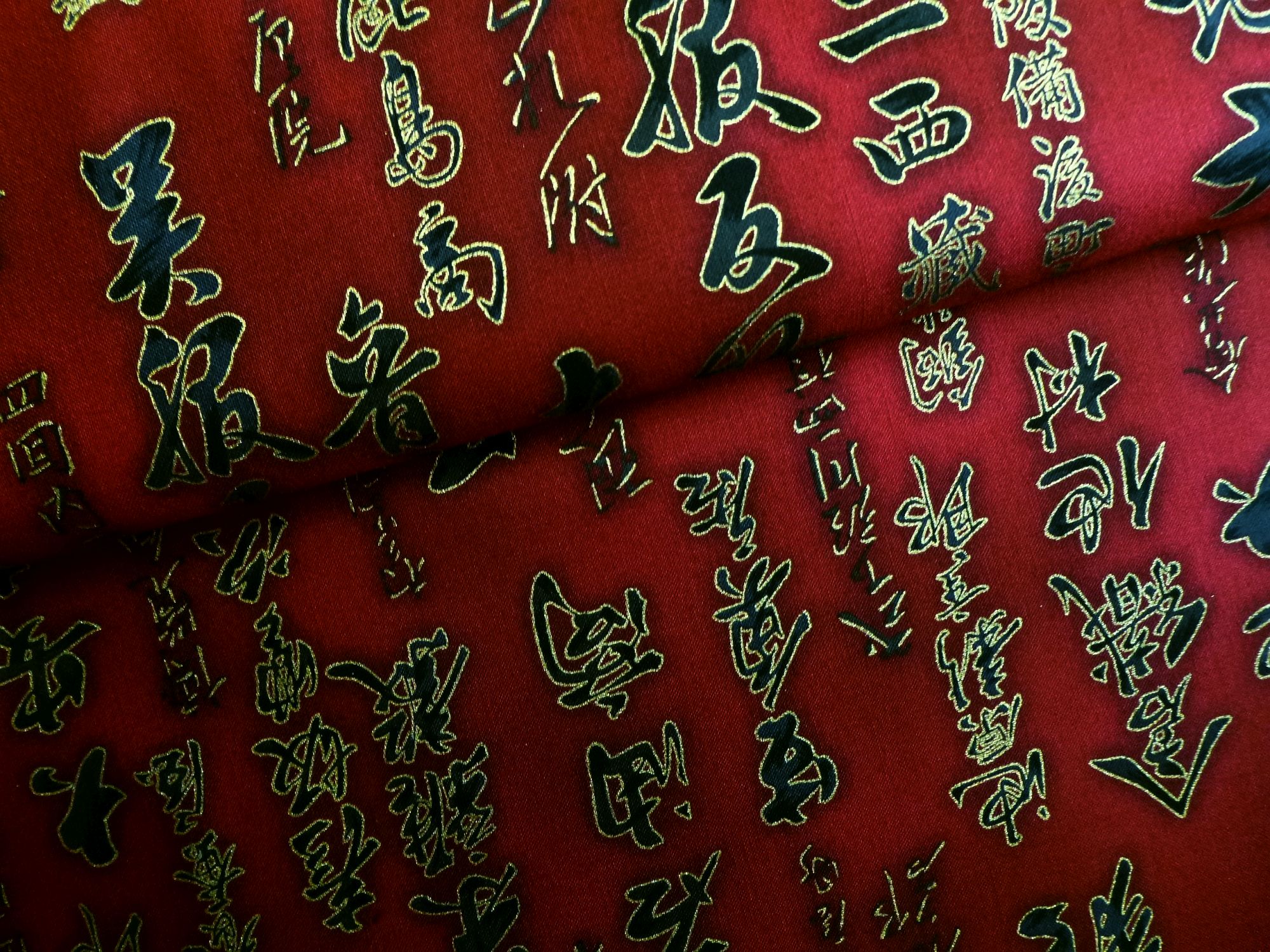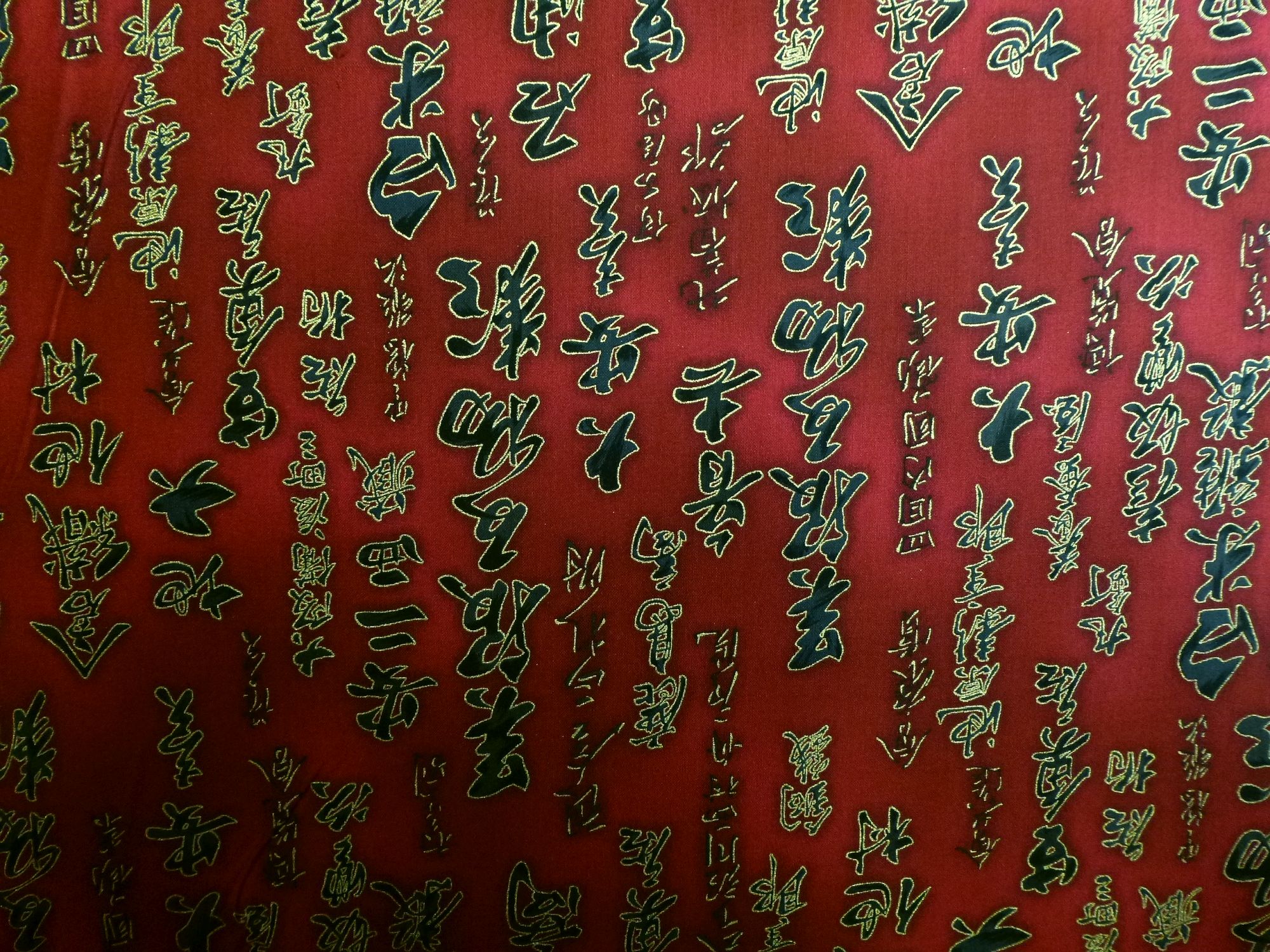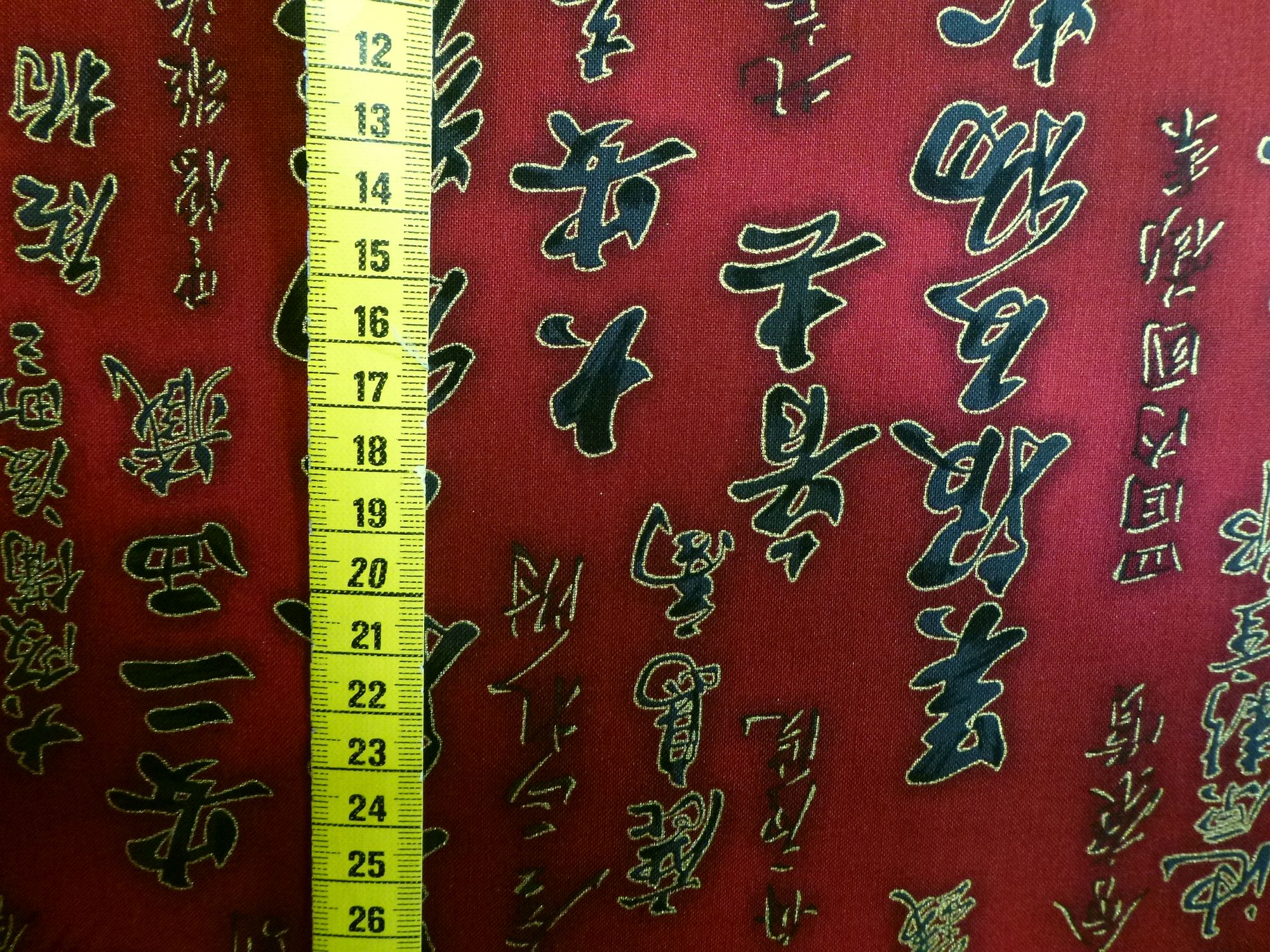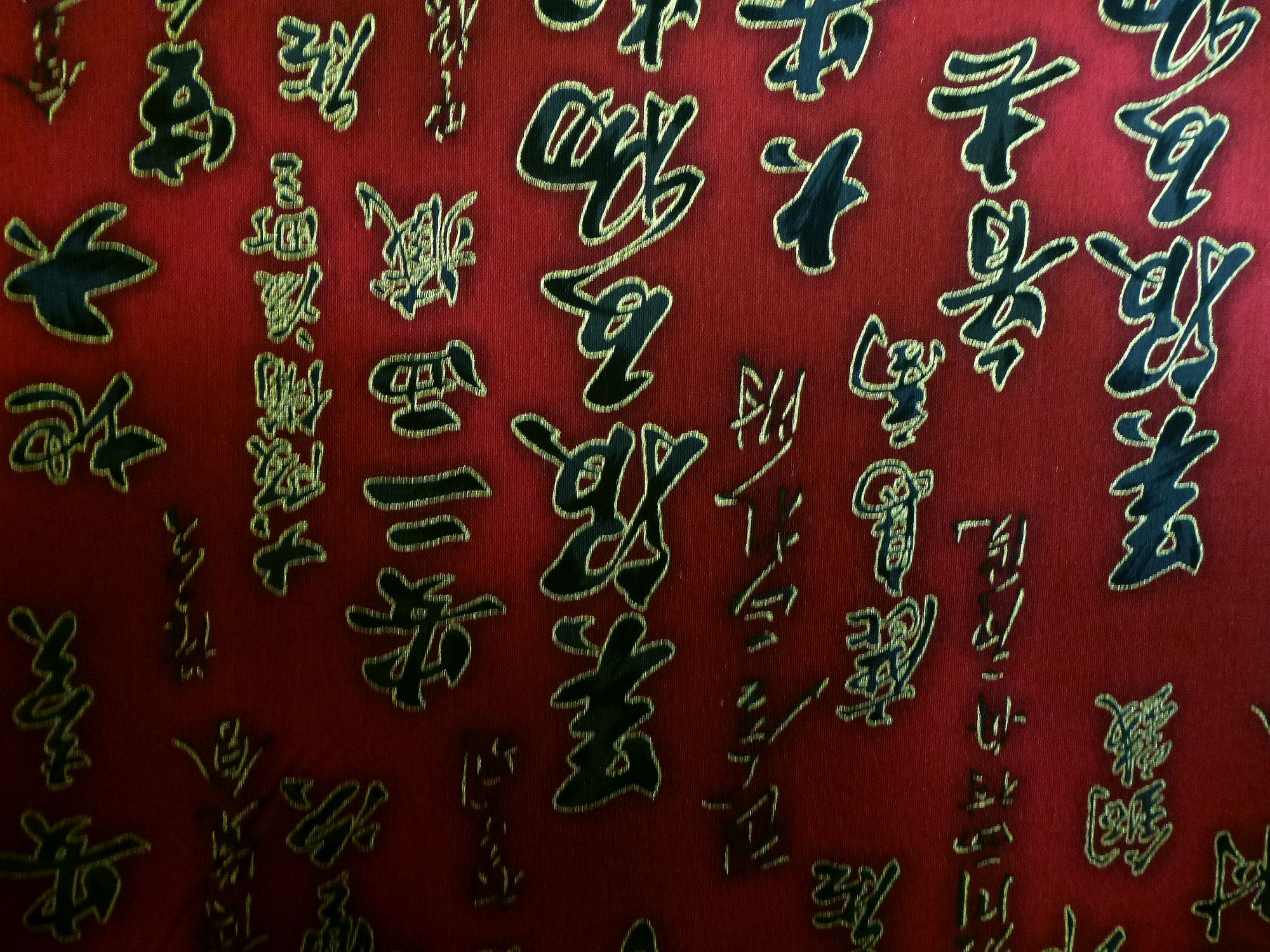 Japanische Schrift in schwarz und gold auf dunkelrotem Untergrund.