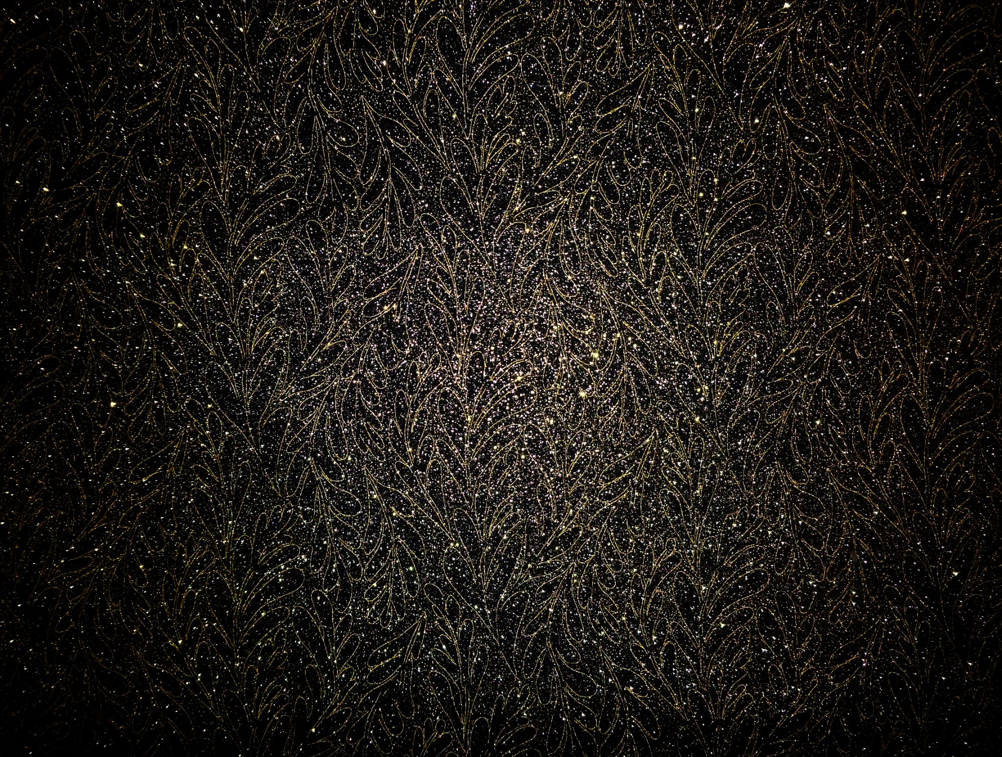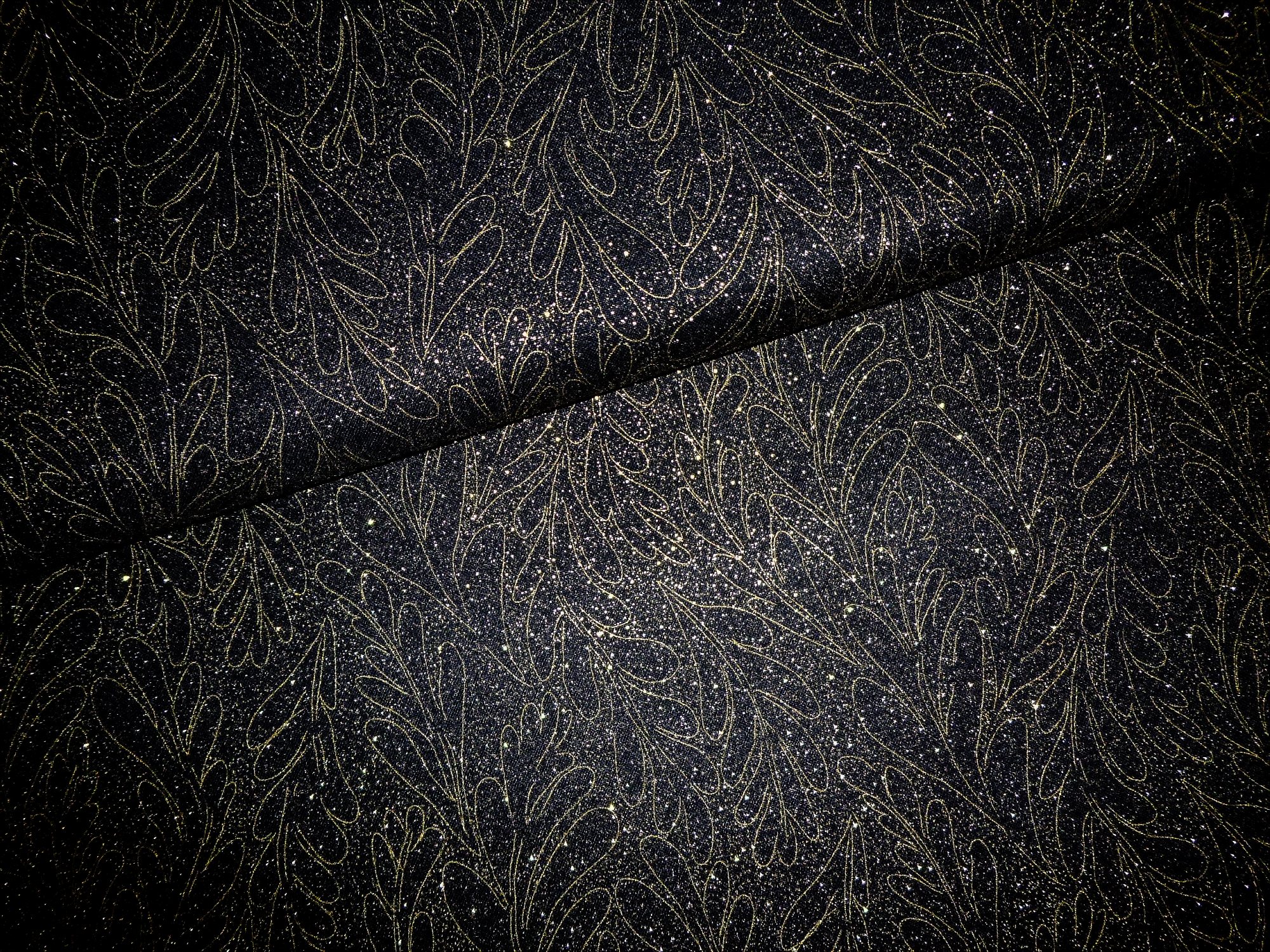 Tiefschwarzer Untergrund mit goldenen Blattranken und goldenem Glitter.