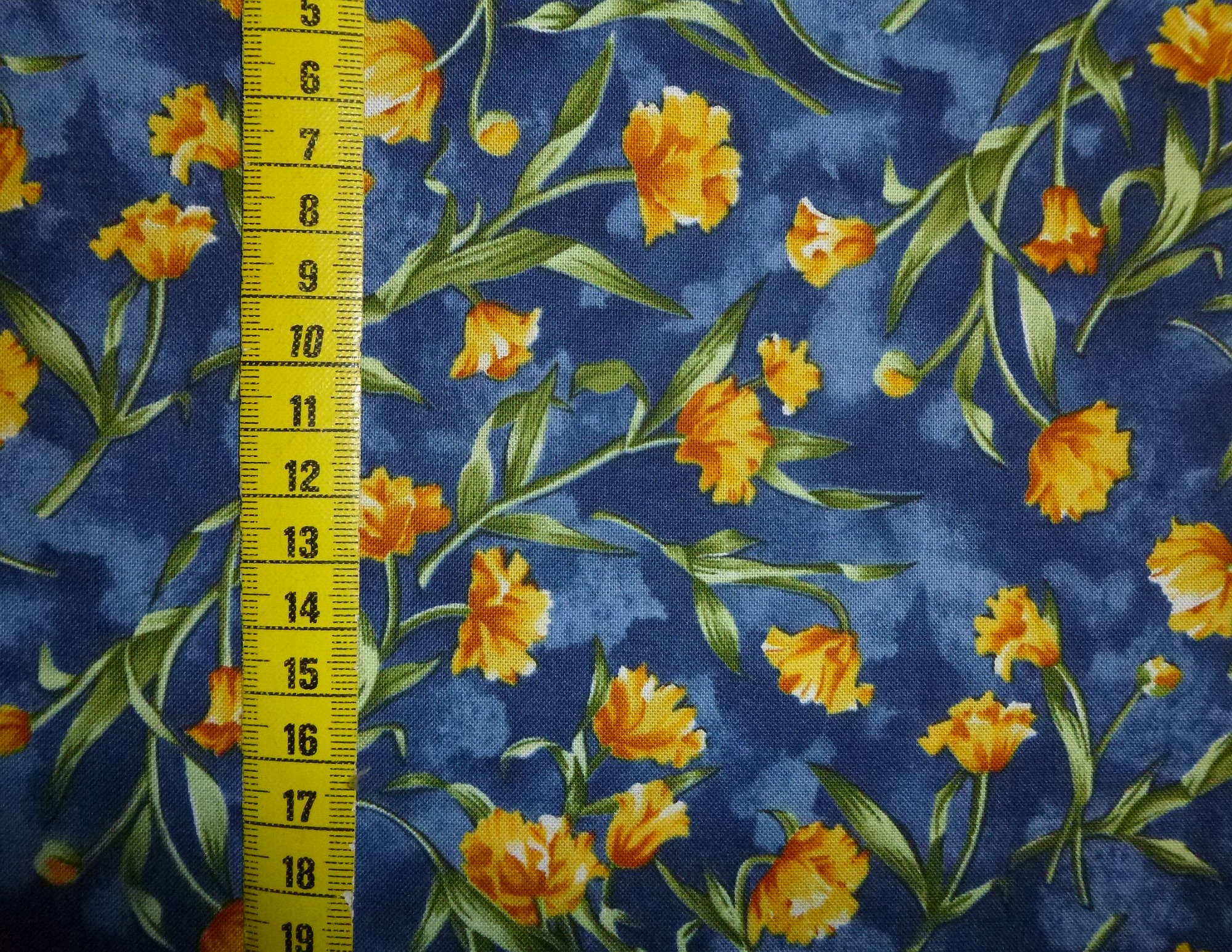 Auf mittelblauem Untergrund sind gelbe Blüten mit olivgrünen Stielen aufgedruckt. Ein fröhlicher, frühlingshafter Blumenstoff, vielseitig kombinierbar.