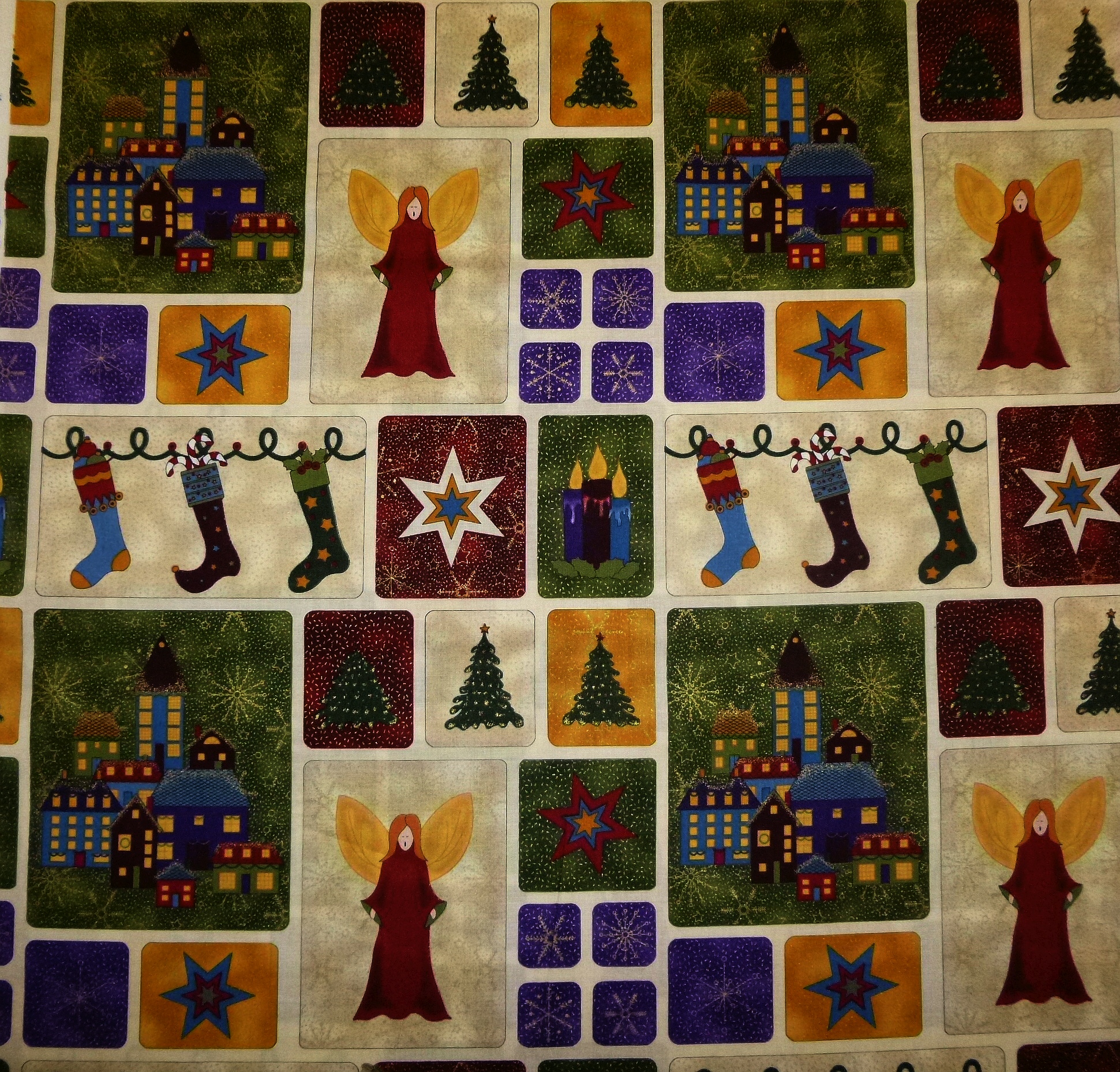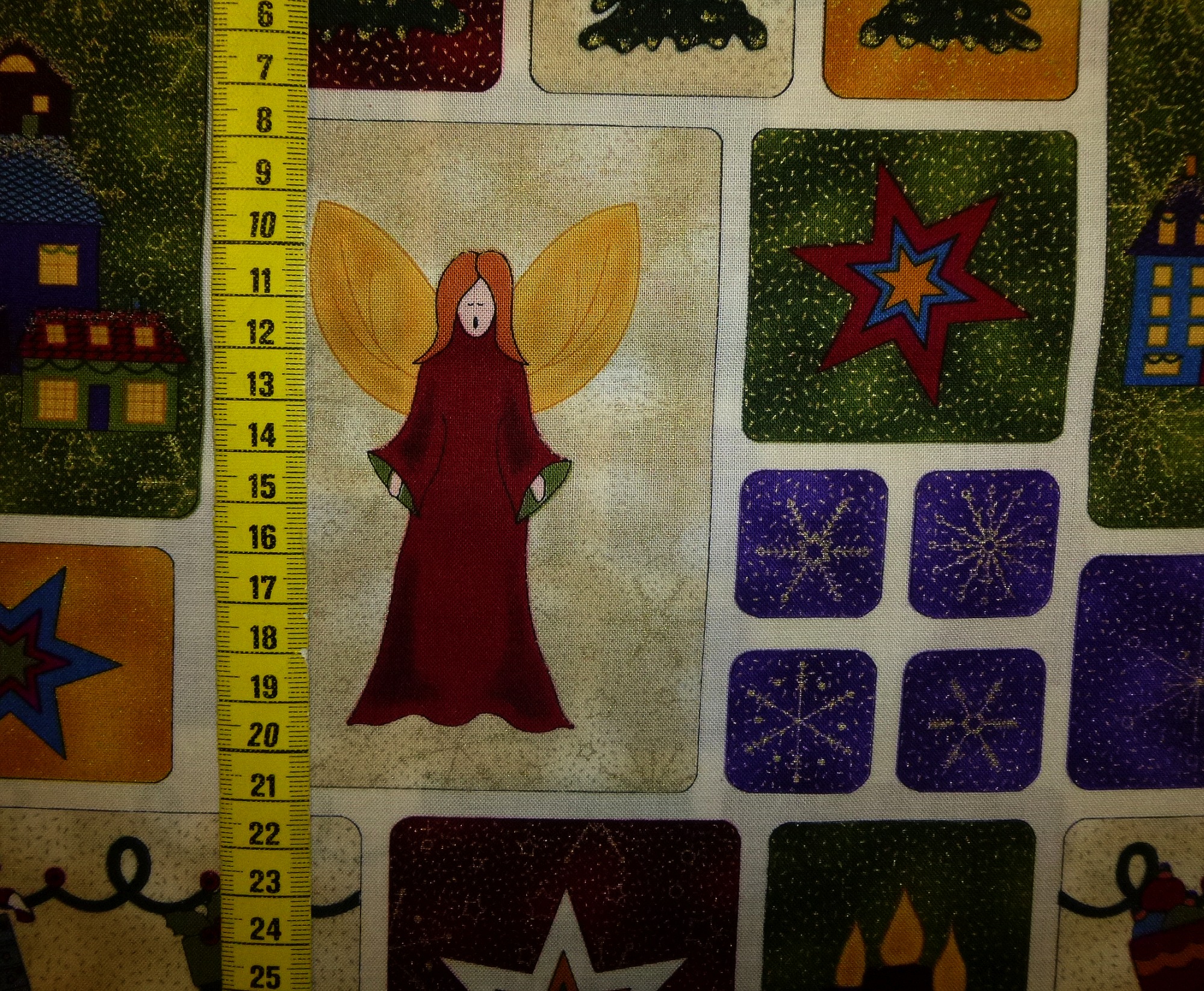Der weihnachtliche Stoff zeigt eine festlich beleuchtete Stadt, dazu Engel, Kerzen, Stern, Tannenbaum u. a. als einzelne Motive. Eine Musterwiederholung ist etwa 30 x 30 cm und daher gut für eine Kissenvorderseite verwendbar. Ein Stoffrapport ist 30 cm hoch. Die Motive können einzeln oder in Sequenzen ausgeschnitten werden. Auch für Karten geeignet.