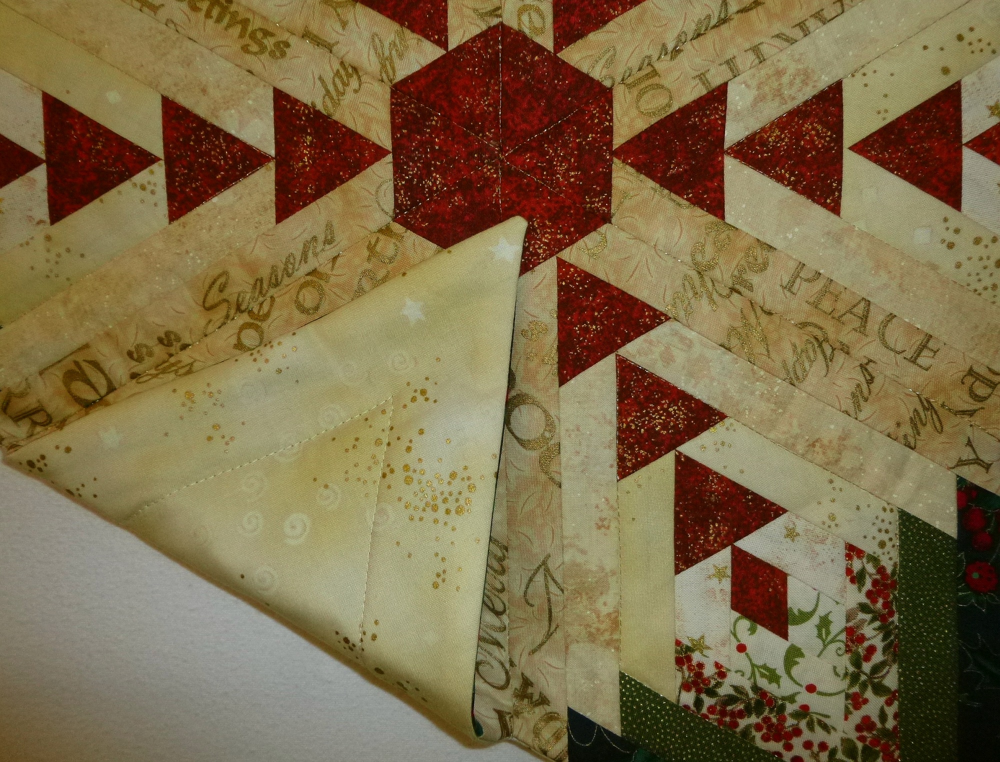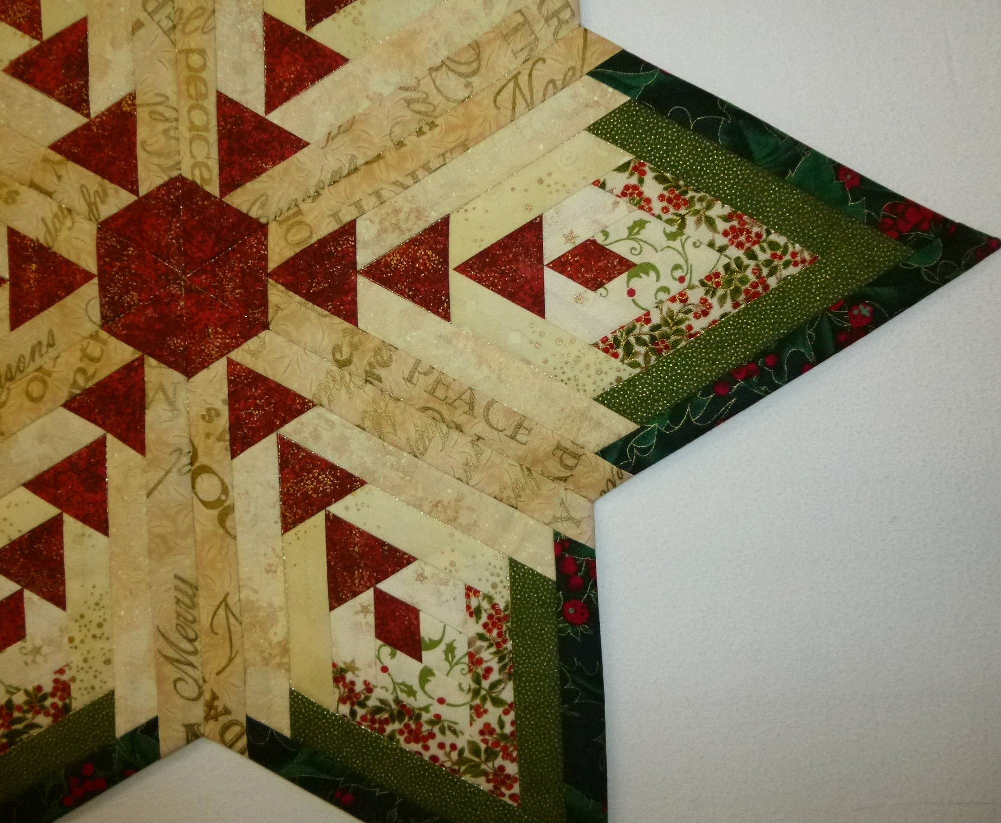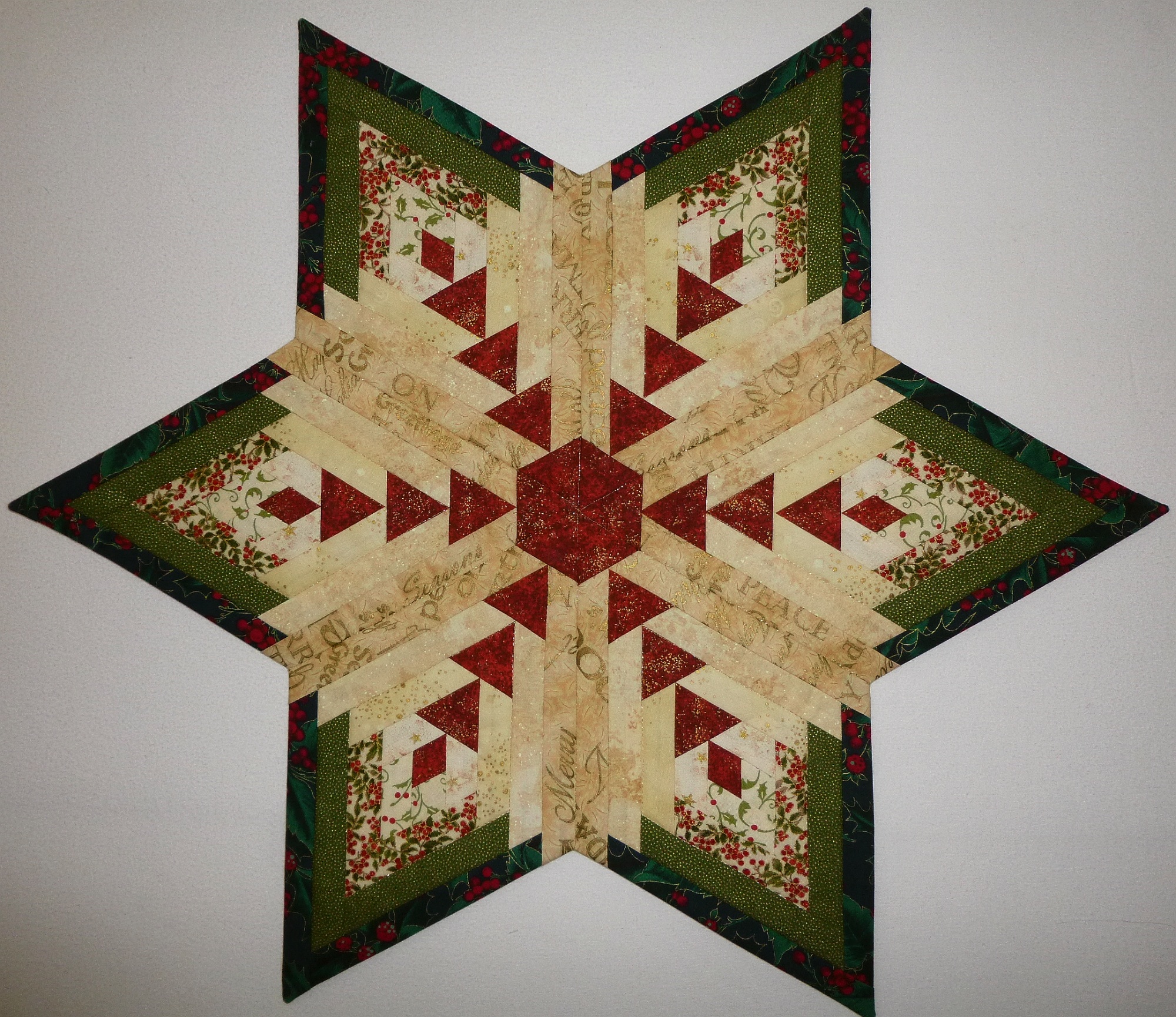 Sternendeckchen aus Patchwork, weihnachtliche Stoffe, Durchmesser von Spitze zu Spitze 61 cm, Breite 52,5 cm, 100 % Baumwolle.